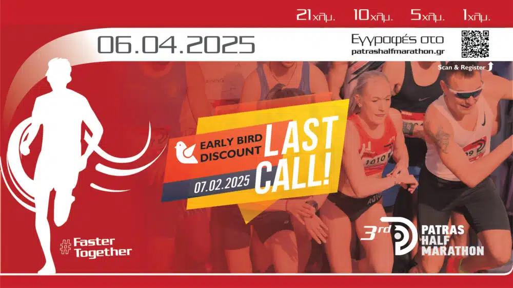 Η αντίστροφη μέτρηση έχει ξεκινήσει! Σε λίγες ημέρες λήγει η περίοδος earlybird εγγραφών για τον 3ο Διεθνή Ημιμαραθώνιο Πάτρας, που θα διεξαχθεί στις 6 Απριλίου 2025.Όσοι επιθυμούν να συμμετάσχουν με μειωμένο κόστος, μπορούν να δηλώσουν συμμετοχή έως την Παρασκευή 7 Φεβρουαρίου μέσω του επίσημου site της διοργάνωσης.