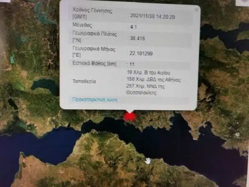 Μεσαίας κλίμακας και με μεγάλο εστιακό βάθος, ήταν ο σεισμός που σημειώθηκε στις 14.20 το μεσημέρι και έγινε αισθητός και στο Αίγιο. Σύμφωνα με το Γεωδυναμικό Ινστιτούτο Αθηνών ο σεισμός ήταν 4,1 βαθμών Ρίχτερ  με επίκεντρο στα 19 χιλιόμετρα βόρεια του Αιγίου και εστιακό βάθος 11 χιλιομέτρων.