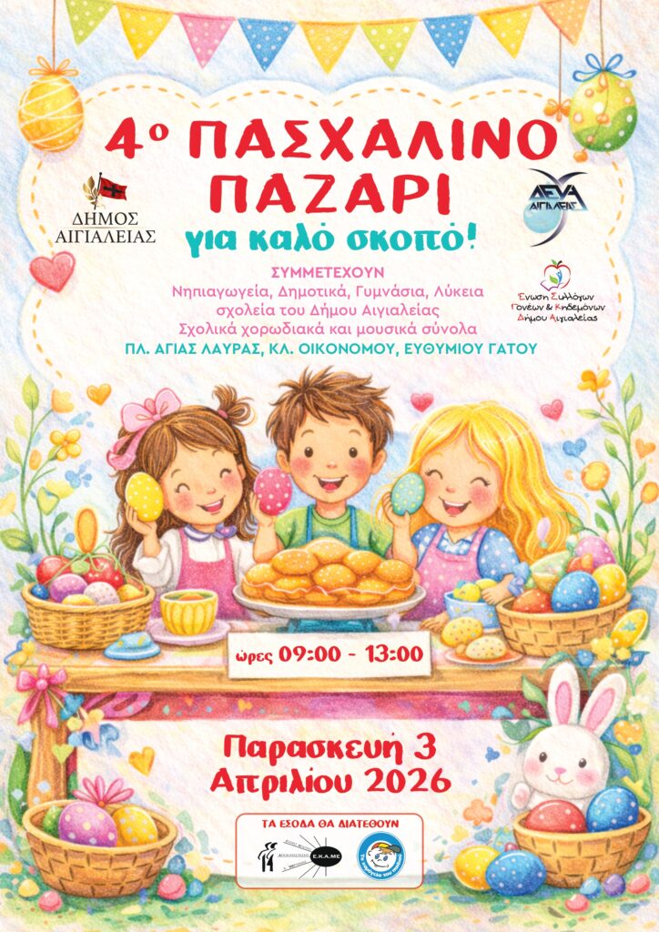 Τη διοργάνωση του 4ου Πασχαλινού Bazaar, που πραγματοποιείται για καλό σκοπό, ανακοίνωσαν ο Αντιδήμαρχος Παιδείας, Διοίκησης & ΚΕΠ και ο Πρόεδρος της Ένωσης Συλλόγων Γονέων και Κηδεμόνων Αιγιαλείας κ.Απόστολος Δεληγάκης, στο πλαίσιο της σημερινής συνέντευξης Τύπου. Η εκδήλωση θα πραγματοποιηθεί την Παρασκευή 3 Απριλίου 2026, από τις 09:00 έως τις 13:00, στην Πλατεία Αγίας Λαύρας, στον πεζόδρομο της οδού Κλεομένους Οικονόμου και Ευθυμίου Γάτου, και εντάσσεται στις δράσεις κοινωνικής προσφοράς της τοπικής εκπαιδευτικής κοινότητας.
