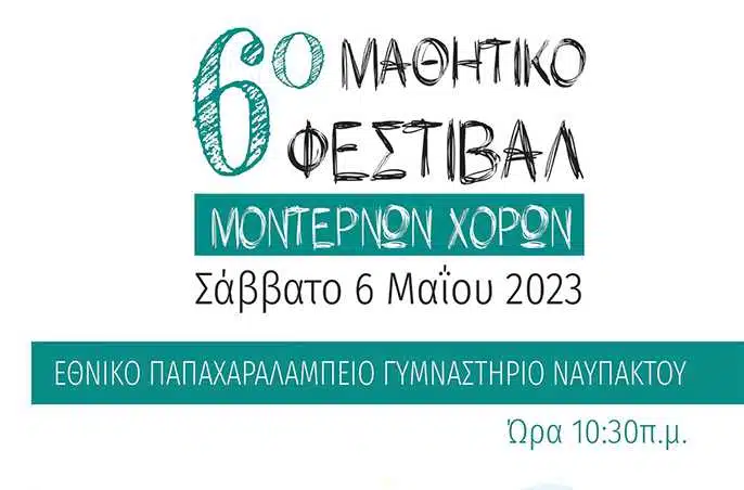 Ο Δήμος Ναυπακτίας και η Διεύθυνση Δευτεροβάθμιας Εκπαίδευσης Αιτωλοακαρνανίας διοργανώνουν αυτό το Σάββατο, 6 Μαΐου 2023 στο Κλειστό του Παπαχαραλαμπείου Σταδίου Ναυπάκτου το 6ο Μαθητικό Φεστιβάλ Μοντέρνων Χορών. Ώρα Έναρξης: 10:30’