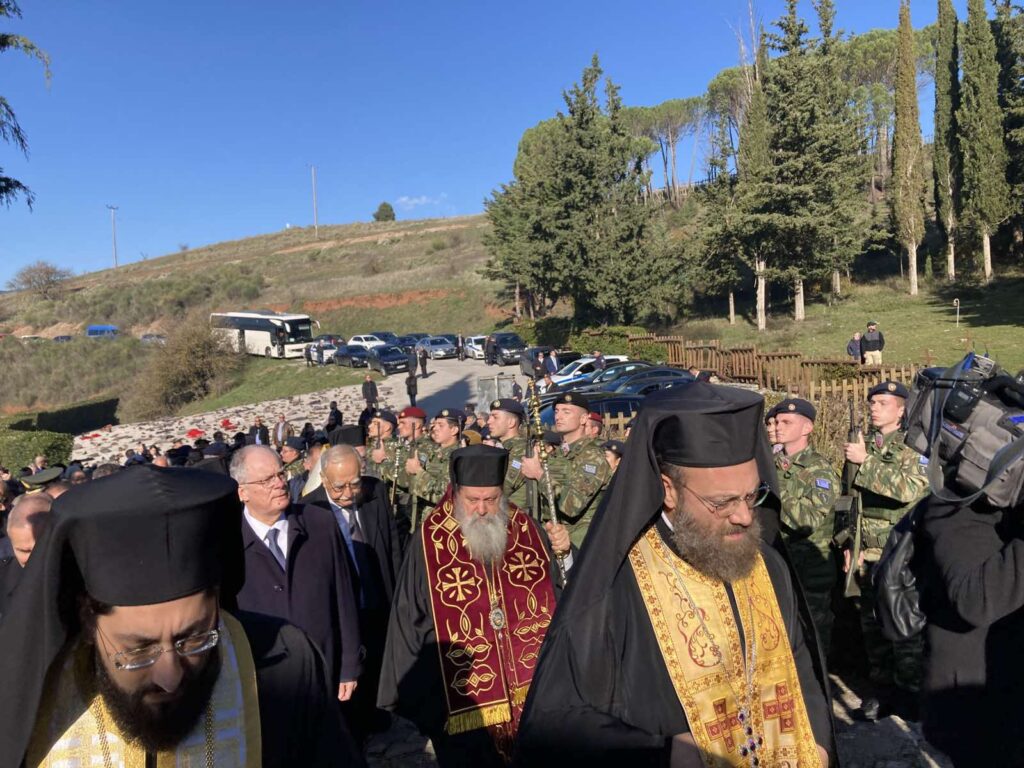 Κατά το πέρας της Θείας Λειτουργίας και προ της τελέσεως του Ιερού Μνημοσύνου υπέρ αναπαύσεως των ψυχών των θυμάτων του Ολοκαυτώματος, ο Σεβασμιώτατος Μητροπολίτης Καλαβρύτων και Αιγιαλείας κ. Ιερώνυμος υποδέχθηκε τον Εξοχώτατο Πρόεδρο της Δημοκρατίας κ. Κωνσταντίνο Τασούλα, συμπαρόντων και του Υφυπουργού Εθνικής Αμύνης κ. Αθανασίου Δαβάκη, ως Εκπροσώπου της Ελληνικής Κυβερνήσεως, Εκπροσώπων των Κομμάτων της Βουλής, Βουλευτών Αχαΐας, Πρέσβεων άλλων Χωρών, του Αντιπεριφερειάρχου Δυτικής Ελλάδος ως Εκπροσώπου του Περιφερειάρχου, του Αντιπεριφερειάρχου Πελοποννήσου, των Δημάρχων Καλαβρύτων, Αιγιαλείας και Κορινθίων μετά μελών των Δημοτικών Συμβουλίων, των Δημάρχων και Εκπροσώπων των Μαρτυρικών Δήμων της Ελλάδος, του Εκπροσώπου του Αρχηγού ΓΕΕΘΑ, Εκπροσώπων των Ενόπλων Δυνάμεων και των Σωμάτων Ασφαλείας, των σεβαστών συγγενών των θυμάτων του Καλαβρυτινού Ολοκαυτώματος, Εκπροσώπων Φορέων της πόλεως των Καλαβρύτων, καθώς και πλήθους λαού, οι οποίοι προσήλθαν με αισθήματα βαθυτάτου σεβασμού στη μνήμη των αδίκως τελειωθέντων αδελφών μας, των μαρτύρων αυτών της εθνικής μας ιστορίας και κληρονομιάς.