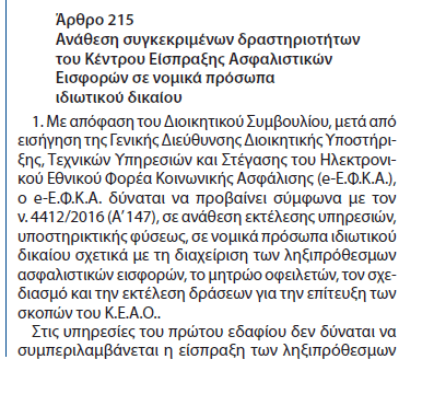 Με το άρθρο 215 του ν. 5193/2025 του Υπουργείου Οικονομικών, ο οποίος τιτλοφορείται “Ενίσχυση της Κεφαλαιαγοράς και άλλες διατάξεις” και δημοσιεύθηκε σήμερα, ανατίθεται εφεξής η “εκτέλεση υπηρεσιών υποστηρικτικής φύσεως” για την είσπραξη των οφειλών των επαγγελματιών προς τον ΕΦΚΑ/ΚΕΑΟ σε ιδιωτικές εισπρακτικές εταιρίες.