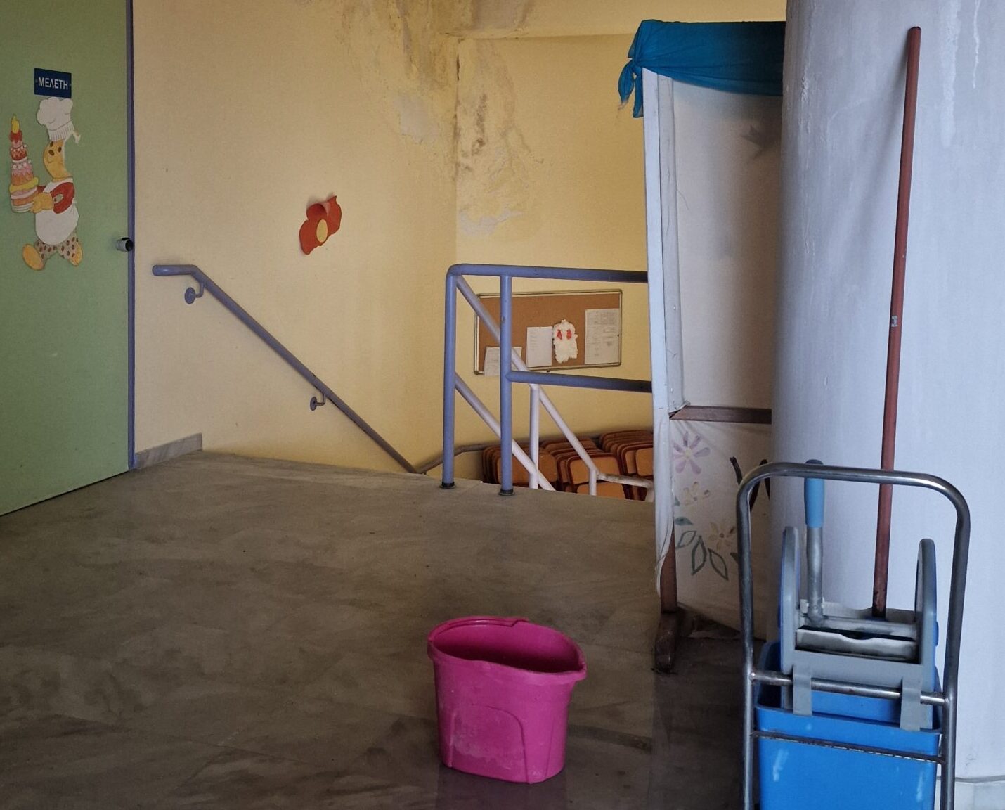 Οι εικόνες που δημοσιοποιούμε αποτελούν αδιάψευστο τεκμήριο. Διαρροές νερού από την οροφή, εκτεταμένες υγρασίες και αποσαθρώσεις δομικών στοιχείων, λιμνάζοντα νερά σε κοινόχρηστους χώρους, κουβάδες τοποθετημένοι πρόχειρα για τη συλλογή νερού. Πρόκειται για συνθήκες που δεν συνάδουν ούτε με στοιχειώδη κανόνες ασφάλειας, πόσο μάλλον με σχολική δομή που φιλοξενεί μαθητές με αναπηρία.