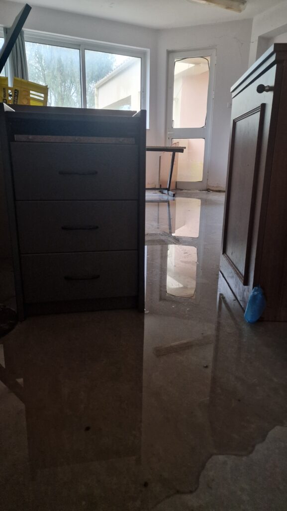 Η κατάσταση επιβαρύνεται περαιτέρω από τις σοβαρές φθορές στο κτίριο. Πρόσφατη πλημμύρα στον πρώτο όροφο προκάλεσε εκτεταμένες ζημιές σε δάπεδα, τοίχους, ηλεκτρολογικές εγκαταστάσεις και εξοπλισμό, με κίνδυνο επέκτασης των υγρασιών στο ισόγειο και στους κοινόχρηστους χώρους. Η άμεση αποκατάσταση των ζημιών είναι επιβεβλημένη.