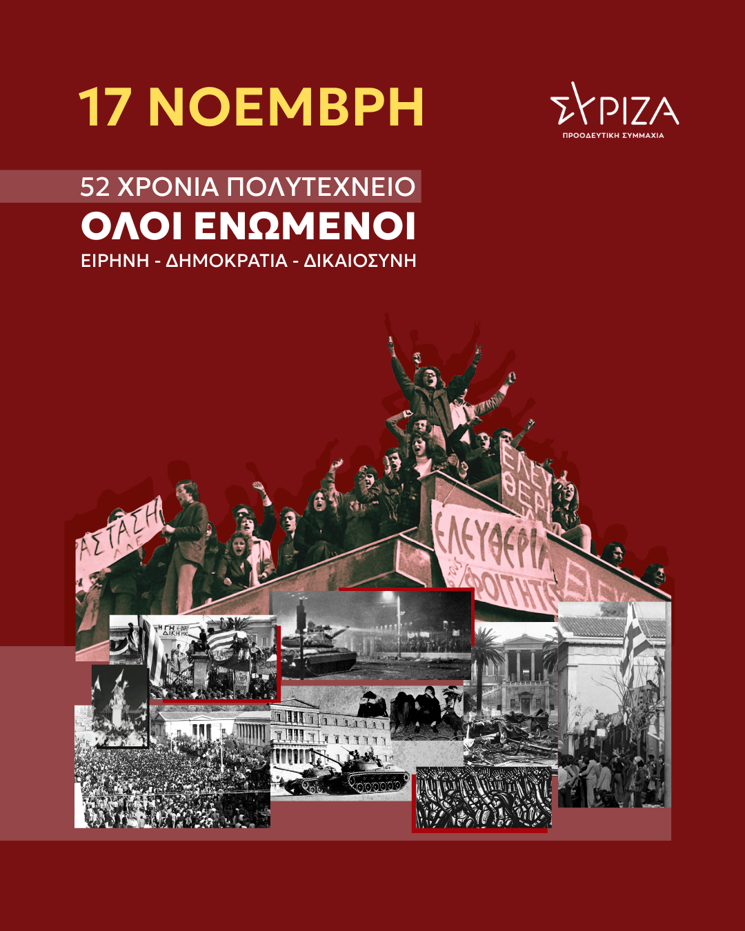 Γιατί και ο αγώνας για ειρήνη δεν είναι ξεκομμένος από το αγωνιστικό μήνυμα του Πολυτεχνείου. Ο αγώνας για περισσότερη δημοκρατία, είναι ανάγκη και καθήκον. Ο αγώνας για το κράτος δικαίου είναι συνυφασμένος με το μήνυμα του Πολυτεχνείου. Ο αγώνας για κοινωνική δικαιοσύνη παραμένει επίκαιρος. Ο αγώνας κατά των ανισοτήτων, κοινωνικών και οικονομικών, είναι ένας δίκαιος αγώνας. Ο αγώνας για ευημερία, δημόσια δωρεάν παιδεία και υγεία είναι καθήκον. Όλοι οι δημοκρατικοί και προοδευτικοί πολίτες οφείλουμε να δώσουμε ενωμένοι αυτό τον αγώνα.