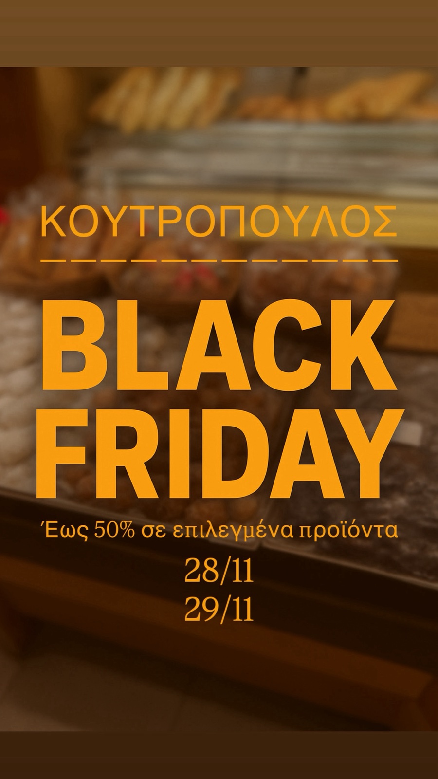Black Friday αλλά και … Saturday αφού οι εκπτώσεις σε αρτοσκευάσματα και γλυκίσματα κρατούν για δύο ημέρες, και Παρασκευή, και Σάββατο, στα αρτοποιεία του Γιώργου Κουτρόπουλου, στο Αίγιο και στο Διακοπτό.