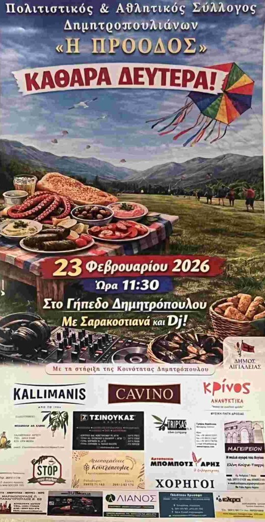 Οι πολιτιστικοί και τοπικοί σύλλογοι της Αιγιάλειας διοργανώνουν εκδηλώσεις για τον εορτασμό της Καθαράς Δευτέρας, τη Δευτέρα 23 Φεβρουαρίου 2026, προσκαλώντας μικρούς και μεγάλους σε μια γιορτή γεμάτη παράδοση, μουσική και σαρακοστιανές γεύσεις.