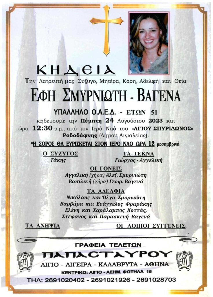 ΑρχικήΚηδείες - Μνημόσυνα Κηδείες - Μνημόσυνα Αιγιάλεια: “ Έφυγε” από τη ζωή η Έφη Σμυρνιώτη-Βαγενά και κηδεύεται αύριο Πέμπτη 24 Αυγούστου Από Aigio Voice 23 Αυγούστου 2023 FacebookXWhatsAppEmail Βρείτε μας στο Google News. Πατήστε εδώ! TagsΚΗΔΕΙΑ-ΓΡΑΦΕΙΑ ΤΕΛΕΤΩΝ ΠΑΠΑΣΤΑΥΡΟΥ μερίδιο FacebookXWhatsAppEmail Προηγούμενο άρθροΚώστας Σβόλης: 35 νέοι υποψήφιοι στην παράταξη Πάτρα ΕνωμένηΕπόμενο άρθροΝεολαία ΣΥΡΙΖΑ Αχαΐας: Η ποιο ανίκανη κυβέρνηση είναι του Κυριάκου Μητσοτάκη Aigio Voicehttps://aigiovoice.gr Σχετικά άρθρα Aigio Voice Radio Γιάννης Βαρδακαστάνης στο Aigio Voice Radio: Για τις πολιτικές εξελίξεις Αίγιο - Αχαΐα Πάτρα: 78χρονη έδωσε ζωή με τα όργανά της Αίγιο - Αχαΐα Ν. Μοίραλης: Το ΠΑΣΟΚ καλεί την ελληνική κοινωνία να αντιδράσει - Advertisement - - Advertisement - - Advertisement - - Advertisement - Δείτε ακόμα Aigio Voice Radio Γιάννης Βαρδακαστάνης στο Aigio Voice Radio: Για τις πολιτικές εξελίξεις Αίγιο - Αχαΐα Πάτρα: 78χρονη έδωσε ζωή με τα όργανά της Αίγιο - Αχαΐα Ν. Μοίραλης: Το ΠΑΣΟΚ καλεί την ελληνική κοινωνία να αντιδράσει Αίγιο - Αχαΐα Αστυνομικές ειδήσεις: Συλλήψεις σε Ηλεία και Αιτωλοακαρνανία Αίγιο - Αχαΐα Πάτρα: Είχε γεμίσει κλεμμένο αυτοκίνητο με κλεμμένα καλώδια και ανταλλακτικά