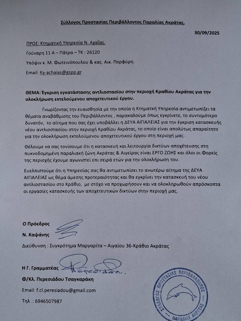 Στο έγγραφο, που απευθύνεται στην ηγεσία της Κτηματικής Υπηρεσίας, ο Σύλλογος τονίζει τη σημασία του έργου, το οποίο έχει ήδη καθυστερήσει για χρόνια, επισημαίνοντας πως αποτελεί ένα πραγματικό «ΕΡΓΟ ΖΩΗΣ» για την πυκνοδομημένη παραλιακή ζώνη Ακράτας και Αιγείρας.