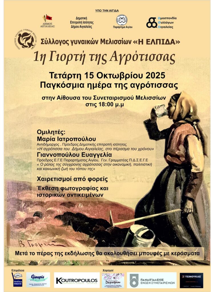 Ο Σύλλογος Γυναικών Μελισσίων Αιγιαλείας «Η Ελπίδα», η Δημοτική Επιτροπή Ισότητας του Δήμου Αιγιαλείας και η Ένωση Γυναικών Ελλάδος σας προσκαλούν με στην 1η Γιορτή της Αγρότισσας, την Τετάρτη 15 Οκτωβρίου 2025, και ώρα 6:00 μ.μ., στην αίθουσα του Συνεταιρισμού Μελισσίων.