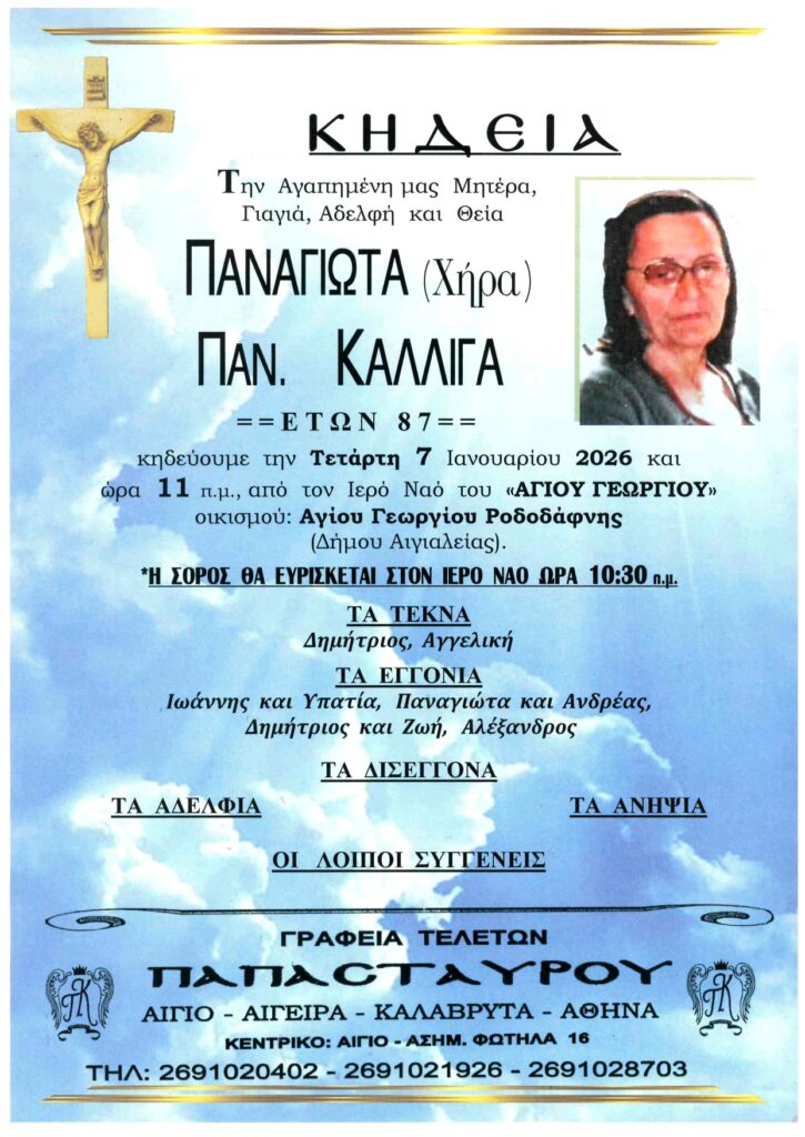ΑρχικήΑίγιο - Αχαΐα Κηδείες - Μνημόσυνα Αιγιάλεια: Κηδεύεται την Τετάρτη 7 Ιανουαρίου η Παναγιώτα Καλλιγά Από Aigio Voice 5 Ιανουαρίου 2026 FacebookTwitterWhatsAppEmail Βρείτε μας στο Google News. Πατήστε εδώ! TagsΑΙΓΙΑΛΕΙΑΚΗΔΕΙΑ-ΓΡΑΦΕΙΑ ΤΕΛΕΤΩΝ ΠΑΠΑΣΤΑΥΡΟΥ μερίδιο FacebookTwitterWhatsAppEmail Προηγούμενο άρθροΠαραδόθηκε αναπηρικό αμαξίδιο στο Αρχαίο Ωδείο ΠατρώνΕπόμενο άρθροΠληρωμές από ΕΦΚΑ, ΔΥΠΑ έως 9 Ιανουαρίου Aigio Voicehttps://aigiovoice.gr Σχετικά άρθρα Αγροτικά Κρίσιμη Μέρα: Τα 4 μέτρα που ανακοινώνει η Κυβέρνηση για τους αγρότες – Και τα πρόστιμα αν συνεχιστούν τα μπλόκα Αίγιο - Αχαΐα Εικαστική “απόβαση” Πατρινού στην Κηφισιά – Φωτο από την Έκθεση με θέμα τη γυναικεία μορφή… Αίγιο - Αχαΐα ΣΟΚ στην Πάτρα: Έξι μήνες μετά το αδελφό του “έφυγε” ο γνωστός επιχειρηματίας Χρ. Ευθυμιάτος (φωτο) - Advertisement - - Advertisement - - Advertisement - - Advertisement - Δείτε ακόμα Αγροτικά Κρίσιμη Μέρα: Τα 4 μέτρα που ανακοινώνει η Κυβέρνηση για τους αγρότες – Και τα πρόστιμα αν συνεχιστούν τα μπλόκα Αίγιο - Αχαΐα Εικαστική “απόβαση” Πατρινού στην Κηφισιά – Φωτο από την Έκθεση με θέμα τη γυναικεία μορφή… Αίγιο - Αχαΐα ΣΟΚ στην Πάτρα: Έξι μήνες μετά το αδελφό του “έφυγε” ο γνωστός επιχειρηματίας Χρ. Ευθυμιάτος (φωτο) Αίγιο - Αχαΐα Πάτρα: Απεργία στις λαϊκές από σήμερα – Πορεία με οχήματα προς την Π.Δ.Ε. (ΒΙΝΤΕΟ) Αίγιο - Αχαΐα Πάτρα: Χειροπέδες σε τρεις ανήλικους για τον ξυλοδαρμό ομοεθνών τους
