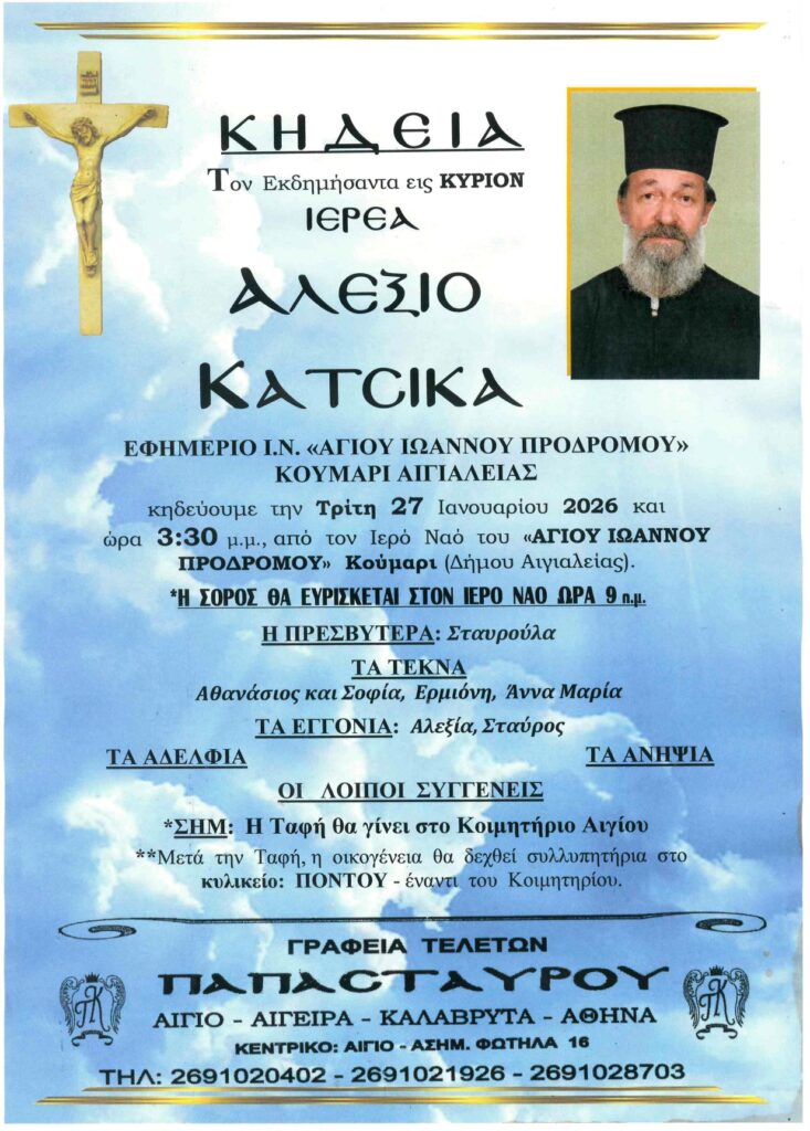 ΑΙΓΙΑΛΕΙΑ: Κηδεύεται την Τρίτη 27 Ιανουαρίου ο ιερέας Αλέξιος Κατσίκας