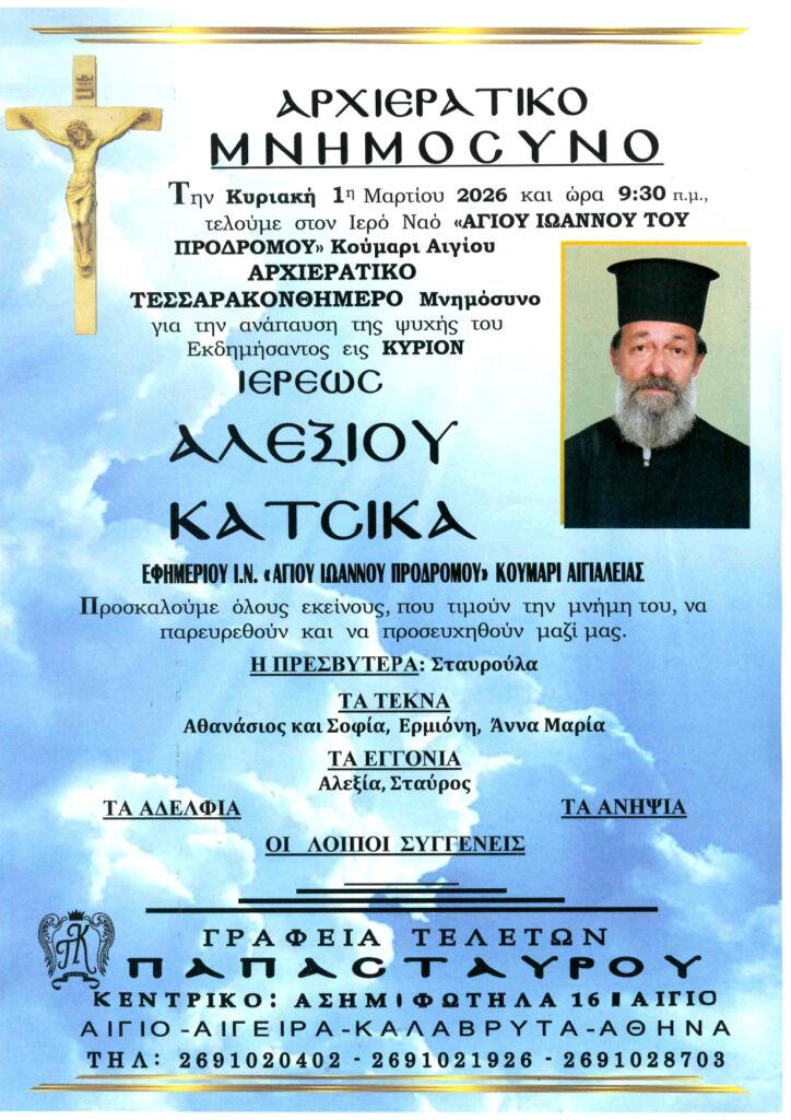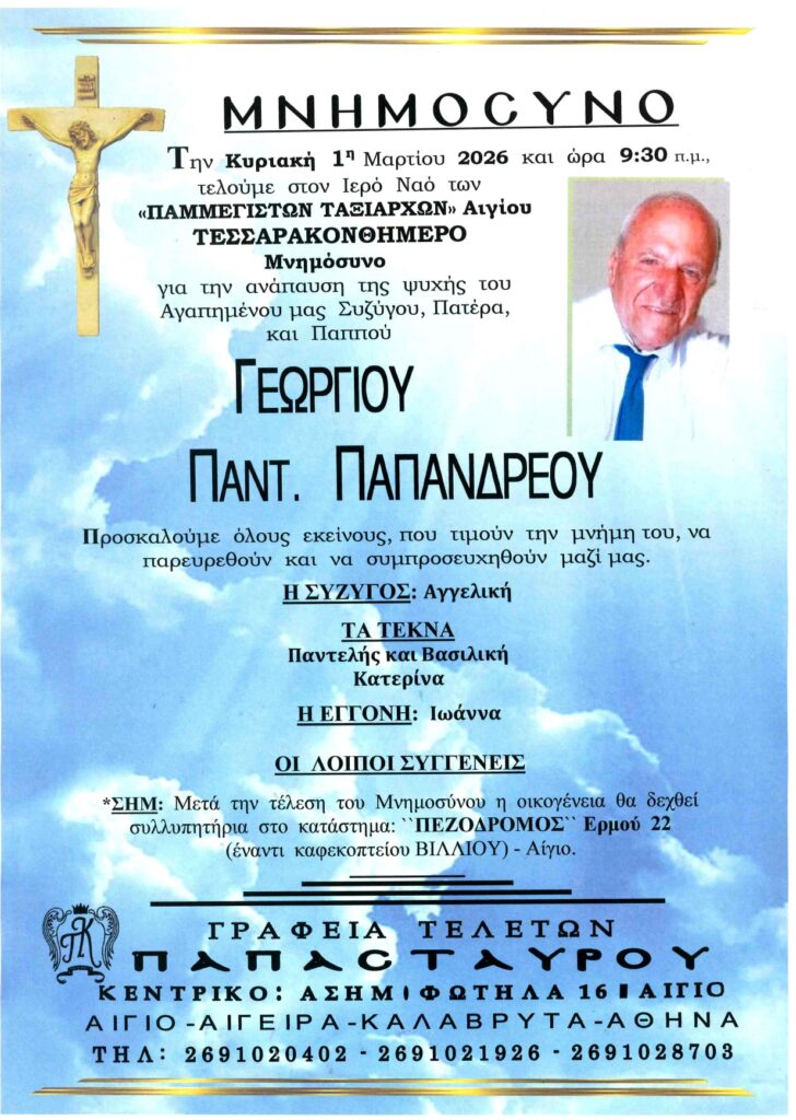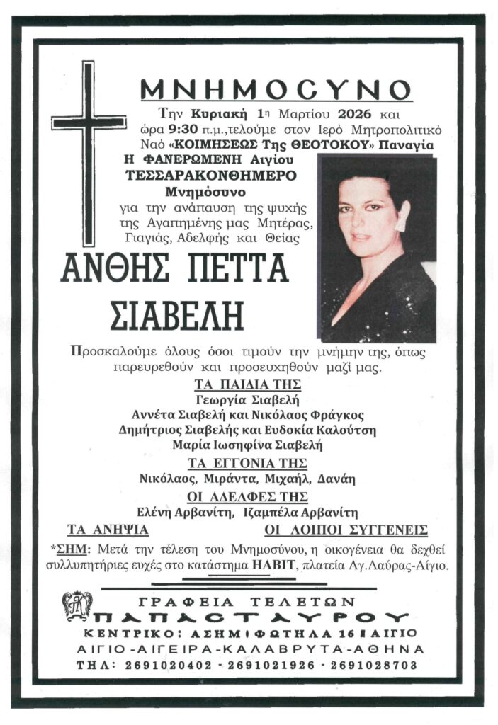 ΑρχικήΑίγιο - Αχαΐα Κηδείες - Μνημόσυνα ΑΙΓΙAΛΕΙΑ: Μνημόσυνα που θα τελεστούν την Κυριακή 1η Μαρτίου Από Aigio Voice 24 Φεβρουαρίου 2026 FacebookTwitterWhatsAppEmail Βρείτε μας στο Google News. Πατήστε εδώ! TagsΑΙΓΙΑΛΕΙΑΑΙΓΙΟΜΝΗΜΟΣΥΝΑ-ΓΡΑΦΕΙΑ ΤΕΛΕΤΩΝ ΠΑΠΑΣΤΑΥΡΟΥ μερίδιο FacebookTwitterWhatsAppEmail Προηγούμενο άρθροΠΑΤΡΑ: Συλλαλητήριο για τα Τέμπη το Σάββατο 28/2 Aigio Voicehttps://aigiovoice.gr Σχετικά άρθρα Αίγιο - Αχαΐα ΠΑΤΡΑ: Συλλαλητήριο για τα Τέμπη το Σάββατο 28/2 Αίγιο - Αχαΐα Πάτρα: Κινητοποίηση Εργατικού Κέντρου για τη δίκη συνδικαλιστών – Συγκέντρωση αύριο το πρωί στα Δικαστήρια Οικονομία Σε κλοιό οι καταθέσεις εσωτερικού και εξωτερικού – 90 χώρες θα εφοδιάζουν την ΑΑΔΕ με δεδομένα - Advertisement - - Advertisement - - Advertisement - - Advertisement - Δείτε ακόμα Αίγιο - Αχαΐα ΠΑΤΡΑ: Συλλαλητήριο για τα Τέμπη το Σάββατο 28/2 Αίγιο - Αχαΐα Πάτρα: Κινητοποίηση Εργατικού Κέντρου για τη δίκη συνδικαλιστών – Συγκέντρωση αύριο το πρωί στα Δικαστήρια Οικονομία Σε κλοιό οι καταθέσεις εσωτερικού και εξωτερικού – 90 χώρες θα εφοδιάζουν την ΑΑΔΕ με δεδομένα Εργασιακά Κυρ. Μητσοτάκης: Νέα αύξηση του κατώτατου μισθού στα τέλη Μαρτίου Οικονομία ΑΔΜΗΕ: Ελάφρυνση 3,7 δισ. ευρώ για τους καταναλωτές έως το 2034