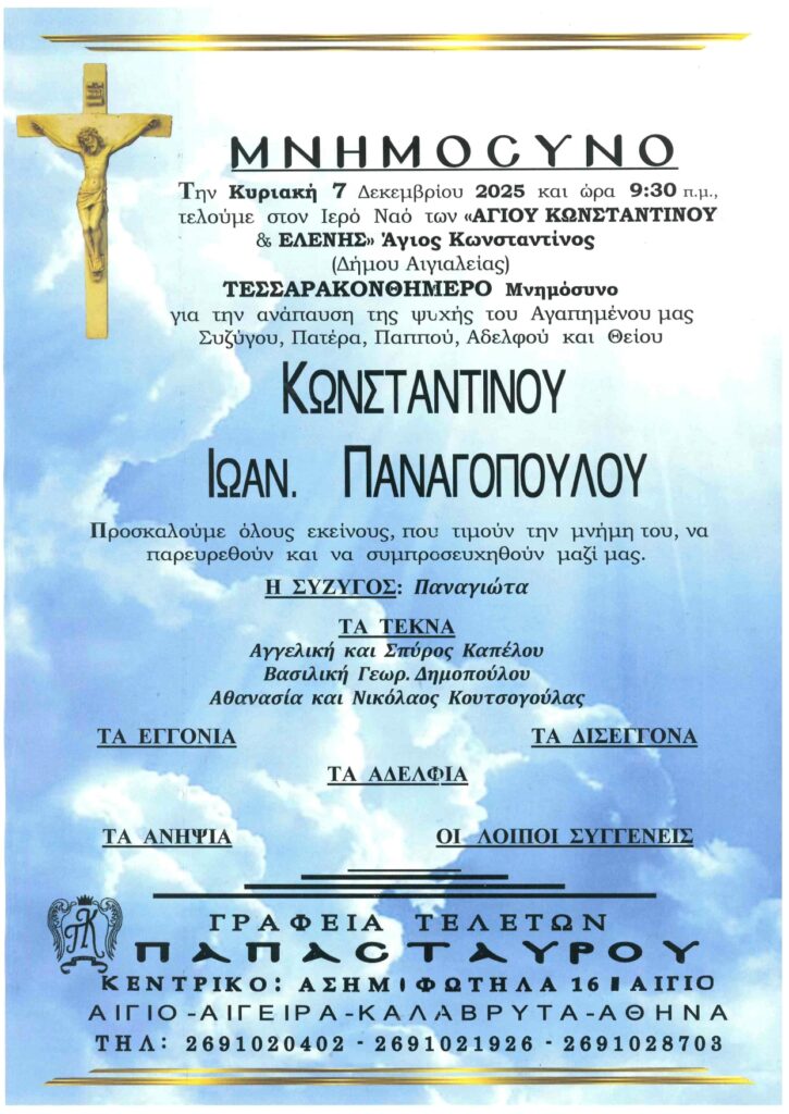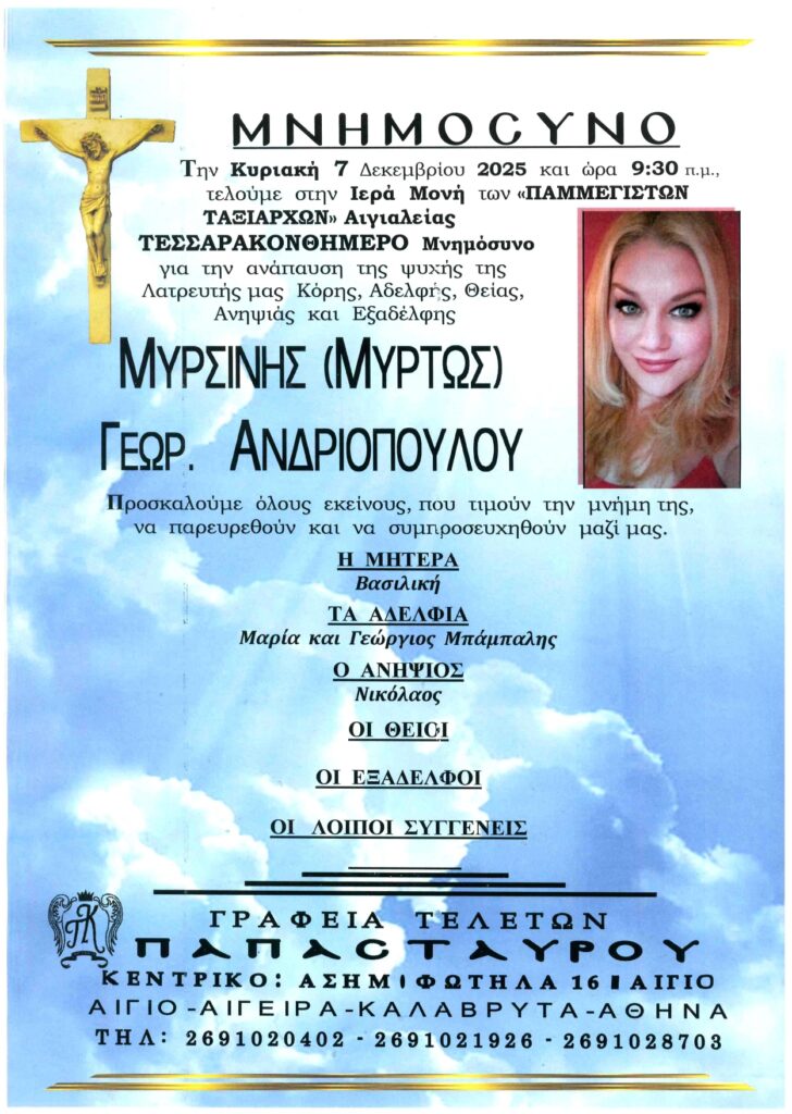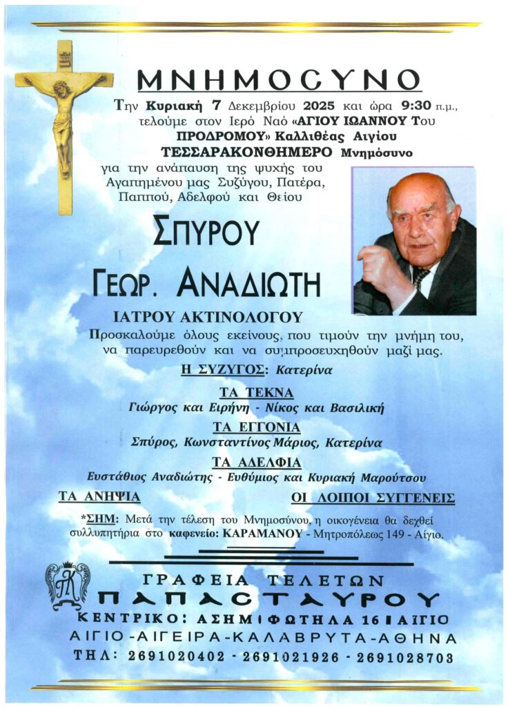 ΑρχικήΑίγιο - Αχαΐα Κηδείες - Μνημόσυνα ΑΙΓΙΑΛΕΙΑ: Μνημόσυνα που θα τελεστούν την Κυριακή 7 Δεκεμβρίου Από Aigio Voice 3 Δεκεμβρίου 2025 FacebookTwitterWhatsAppEmail Βρείτε μας στο Google News. Πατήστε εδώ! TagsΑΙΓΙΑΛΕΙΑΑΙΓΙΟΜΝΗΜΟΣΥΝΑ-ΓΡΑΦΕΙΑ ΤΕΛΕΤΩΝ ΠΑΠΑΣΤΑΥΡΟΥ μερίδιο FacebookTwitterWhatsAppEmail Προηγούμενο άρθροΟ Τσίπρας μάζεψε όλον τον ΣΥΡΙΖΑ και την Νέα Αριστερά στην παρουσίαση της «Ιθάκης» και προανήγγειλε νέο κόμμα Aigio Voicehttps://aigiovoice.gr Σχετικά άρθρα Ελλάδα Ο Τσίπρας μάζεψε όλον τον ΣΥΡΙΖΑ και την Νέα Αριστερά στην παρουσίαση της «Ιθάκης» και προανήγγειλε νέο κόμμα Αγροτικά Ψήφισμα στήριξης από το Εργατικό Κέντρο Αιγίου στον αγώνα των αγροτών της Αιγιάλειας Πολιτική Ευρωβουλευτές ΠΑΣΟΚ: «Δεν θα επιτρέψουμε την παράδοση της ευρωπαϊκής παραγωγής ρυζιού σε ανεξέλεγκτες εισαγωγές» - Advertisement - - Advertisement - - Advertisement - - Advertisement - Δείτε ακόμα Ελλάδα Ο Τσίπρας μάζεψε όλον τον ΣΥΡΙΖΑ και την Νέα Αριστερά στην παρουσίαση της «Ιθάκης» και προανήγγειλε νέο κόμμα Αγροτικά Ψήφισμα στήριξης από το Εργατικό Κέντρο Αιγίου στον αγώνα των αγροτών της Αιγιάλειας Πολιτική Ευρωβουλευτές ΠΑΣΟΚ: «Δεν θα επιτρέψουμε την παράδοση της ευρωπαϊκής παραγωγής ρυζιού σε ανεξέλεγκτες εισαγωγές» Αθλητικά Με οργανωμένη μετακίνηση στον Πύργο οι φίλοι του Παναιγιάλειου Ελλάδα Β. Κικίλιας: Νέο νομοσχέδιο για μηχανισμό ελέγχου και ασφάλειας σε λιμάνια και πλοία