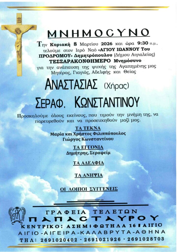 ΑΙΓΙΑΛΕΙΑ: Μνημόσυνα που θα τελεστούν το Σάββατο 7 και την Κυριακή 8 Μαρτίου