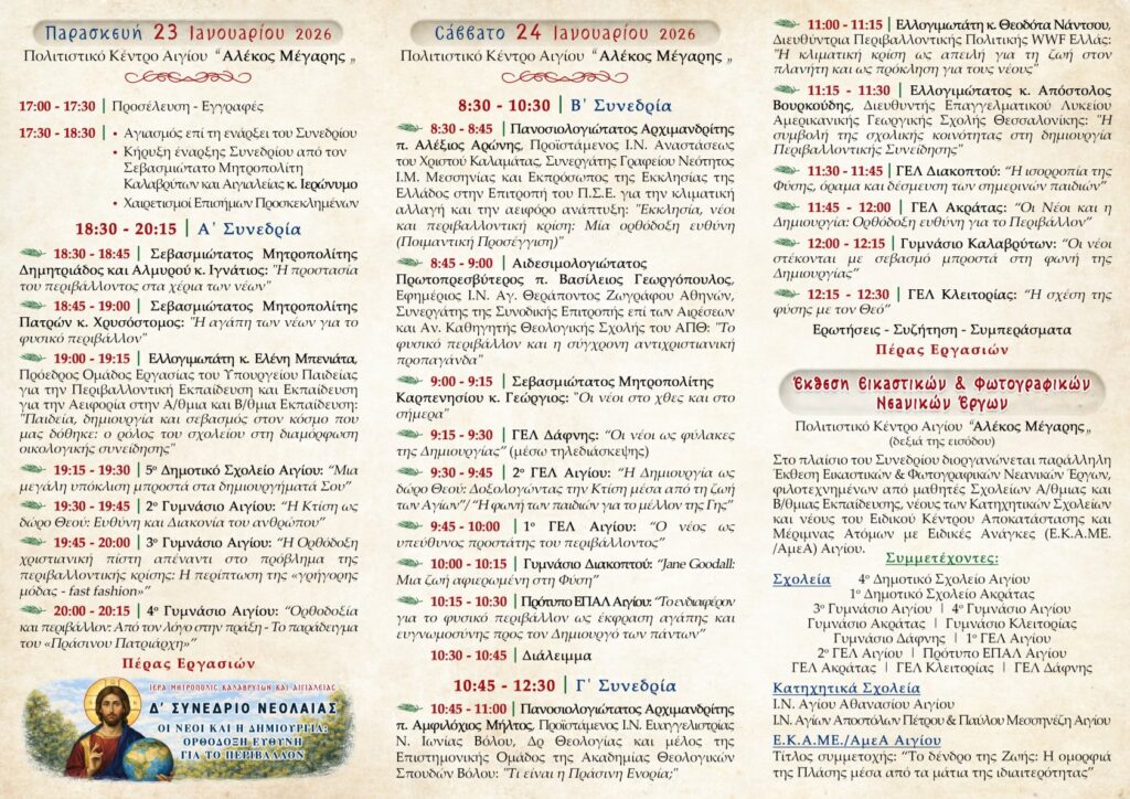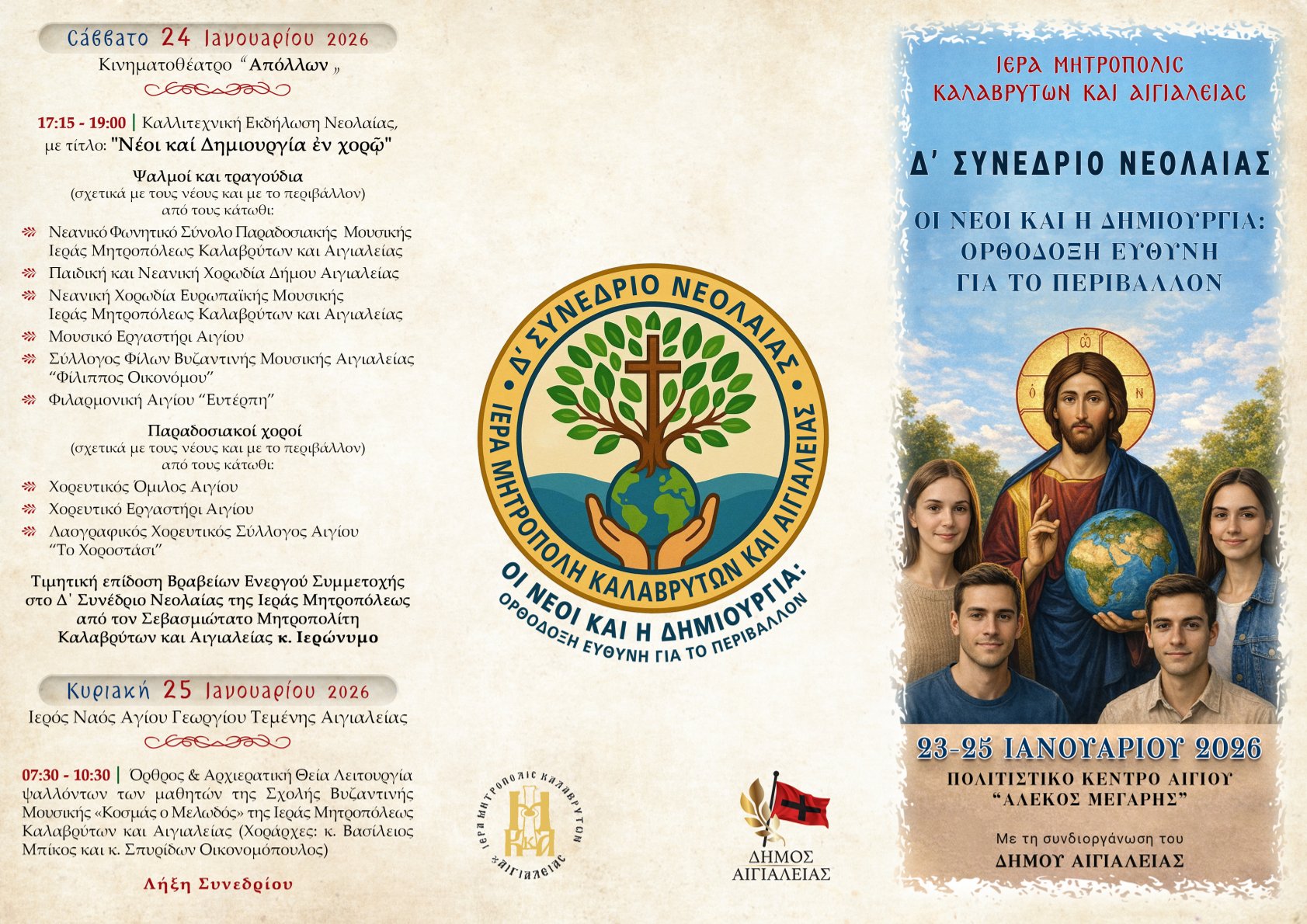 Η Ιερά Μητρόπολη Καλαβρύτων και Αιγιαλείας, στο πλαίσιο της αδιάλειπτης μέριμνάς Της υπέρ της νεολαίας και της σχέσεως Αυτής με τις αξίες της Ορθόδοξης παράδοσης, διοργανώνει το Δ΄ Συνέδριο Νεολαίας, με θέμα: «Οι Νέοι και η Δημιουργία: Ορθόδοξη Ευθύνη για το Περιβάλλον». Το Συνέδριο τελεί υπό την αιγίδα του Σεβασμιωτάτου Μητροπολίτου Καλαβρύτων και Αιγιαλείας κ. Ιερωνύμου και συνδιοργανώνεται με τον Δήμο Αιγιαλείας, με τη συνδρομή της Περιφέρειας Δυτικής Ελλάδος.