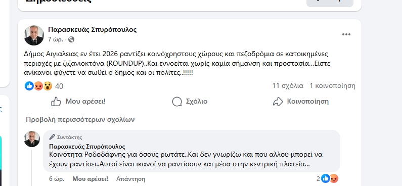 Μια καταγγελία προκάλεσε έντονο θόρυβο και δικαιολογημένα. Όλα ξεκίνησαν από την αποκάλυψη του κ. Παρασκευά Σπυρόπουλου για χρήση ζιζανιοκτόνων (ROUNDUP) σε ραντίσματα σε κοινόχρηστους χώρους και σε πεζοδρόμια, σε κατοικημένες περιοχές του Δήμου Αιγιαλείας.