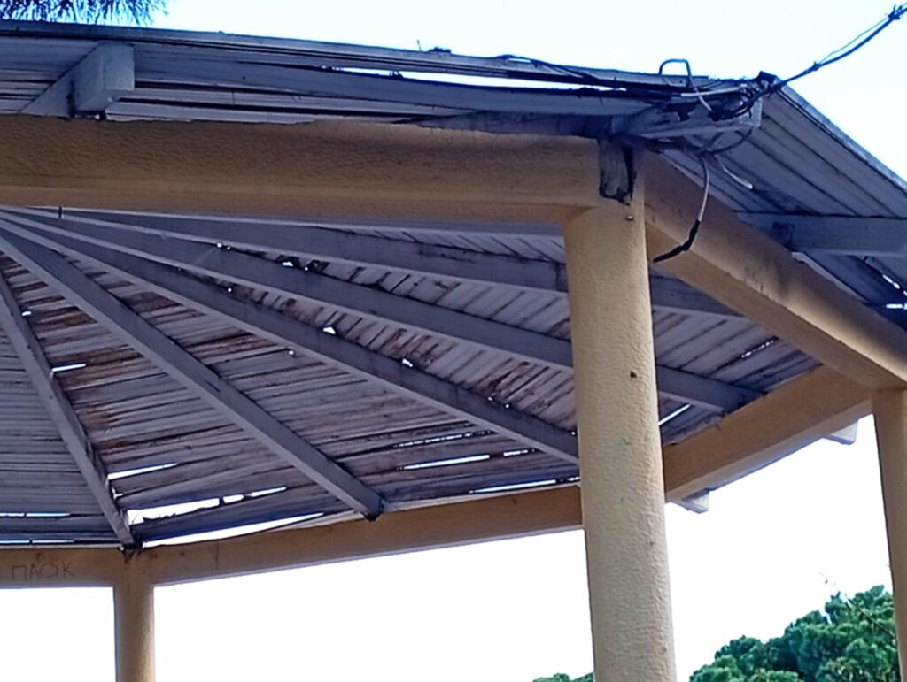 Και σήμερα, νέο επεισόδιο στο σίριαλ : όχι μόνο κεραμίδια δεν υπάρχουν, αλλά απομακρύνθηκαν και τα ξύλα της σκεπής! Το μόνο που απέμεινε πλέον είναι οι… κολώνες, θυμίζοντας περισσότερο μνημείο αρχαιολογικού ενδιαφέροντος παρά κιόσκι προς επισκευή.