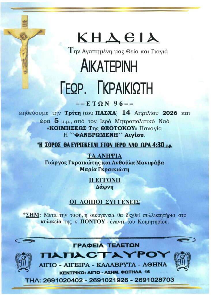 ΑρχικήΑίγιο - Αχαΐα Κηδείες - Μνημόσυνα Αίγιο: “Έφυγε” από τη ζωή η Αικατερίνη Γκραικιώτη και κηδεύεται την Τρίτη (του Πάσχα) 14 Απριλίου Από Aigio Voice 11 Απριλίου 2026 FacebookXWhatsAppEmail Βρείτε μας στο Google News. Πατήστε εδώ! TagsΑΙΓΙΟΚΗΔΕΙΑ-ΓΡΑΦΕΙΑ ΤΕΛΕΤΩΝ ΠΑΠΑΣΤΑΥΡΟΥ μερίδιο FacebookXWhatsAppEmail Προηγούμενο άρθροΑΙΓΙΟ: Άφιξη του Αγίου Φωτός και διανομή στους Ιερούς Ναούς της ΜητροπόλεωςΕπόμενο άρθροΠΑΤΡΑ: Στα χέρια της Αστυνομίας καταζητούμενος για απόπειρα ανθρωποκτονίας Aigio Voicehttps://aigiovoice.gr Σχετικά άρθρα Αρθρογραφία Η Ανάσταση σηματοδοτεί την ελπίδα Αίγιο - Αχαΐα ΠΑΤΡΑ: Στα χέρια της Αστυνομίας καταζητούμενος για απόπειρα ανθρωποκτονίας Αίγιο - Αχαΐα ΑΙΓΙΟ: Άφιξη του Αγίου Φωτός και διανομή στους Ιερούς Ναούς της Μητροπόλεως - Advertisement - - Advertisement - - Advertisement - - Advertisement - Δείτε ακόμα Αρθρογραφία Η Ανάσταση σηματοδοτεί την ελπίδα Αίγιο - Αχαΐα ΠΑΤΡΑ: Στα χέρια της Αστυνομίας καταζητούμενος για απόπειρα ανθρωποκτονίας Αίγιο - Αχαΐα ΑΙΓΙΟ: Άφιξη του Αγίου Φωτός και διανομή στους Ιερούς Ναούς της Μητροπόλεως Αίγιο - Αχαΐα Αίγιο: “Έφυγε” από τη ζωή η Ειρήνη Διαμαντοπούλου και κηδεύεται την Τρίτη (του Πάσχα) 14 Απριλίου Αίγιο - Αχαΐα Η Ακολουθία του Επιταφίου Θρήνου στην Ιερά Μητρόπολη Καλαβρύτων και Αιγιαλείας