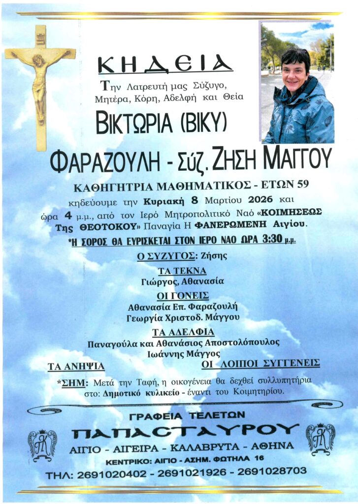 ΑρχικήΑίγιο - Αχαΐα Κηδείες - Μνημόσυνα ΑΙΓΙΟ: Έφυγε από τη ζωή η Βικτωρία Φαραζουλή-Μάγγου σε ηλικία 59 ετών Από Aigio Voice 6 Μαρτίου 2026 FacebookXWhatsAppEmail Βρείτε μας στο Google News. Πατήστε εδώ! TagsΑΙΓΙΑΛΕΙΑΑΙΓΙΟΚΗΔΕΙΑ-ΓΡΑΦΕΙΑ ΤΕΛΕΤΩΝ ΠΑΠΑΣΤΑΥΡΟΥ μερίδιο FacebookXWhatsAppEmail Προηγούμενο άρθροΑΕΠ +2,1% το 2025 – Φόβοι για επιπτώσεις από τον πόλεμο το 2026 Aigio Voicehttps://aigiovoice.gr Σχετικά άρθρα Ελλάδα ΑΕΠ +2,1% το 2025 – Φόβοι για επιπτώσεις από τον πόλεμο το 2026 Ελλάδα Καύσιμα: Πιέσεις στις τιμές της βενζίνης και πετρελαίου Εργασιακά ΔΥΠΑ: Πρόγραμμα με μισθό 1.200 ευρώ για μακροχρόνια ανέργους - Advertisement - - Advertisement - - Advertisement - - Advertisement - Δείτε ακόμα Ελλάδα ΑΕΠ +2,1% το 2025 – Φόβοι για επιπτώσεις από τον πόλεμο το 2026 Ελλάδα Καύσιμα: Πιέσεις στις τιμές της βενζίνης και πετρελαίου Εργασιακά ΔΥΠΑ: Πρόγραμμα με μισθό 1.200 ευρώ για μακροχρόνια ανέργους Αίγιο - Αχαΐα Η Δ/νση Αθμιας και Βθμιας Εκπαίδευσης Δυτικής Ελλάδας στο PatrasIQ 2026 Αίγιο - Αχαΐα ΕΛΤΑ: Πλησιάζει η ώρα της περαιτέρω συρρίκνωσης – Ποια ακόμα καταστήματα θα κλείσουν