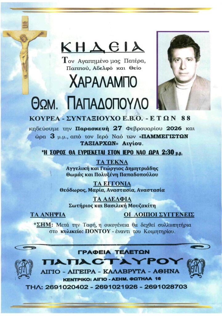 ΑρχικήΑίγιο - Αχαΐα Κηδείες - Μνημόσυνα Αίγιο: “Έφυγε” από τη ζωή ο Χαράλαμπος Παπαδόπουλος και κηδεύεται την Παρασκευή 27 Φεβρουαρίου Από Aigio Voice 26 Φεβρουαρίου 2026 FacebookTwitterWhatsAppEmail Βρείτε μας στο Google News. Πατήστε εδώ! TagsΑΙΓΙΟΚΗΔΕΙΑ-ΓΡΑΦΕΙΑ ΤΕΛΕΤΩΝ ΠΑΠΑΣΤΑΥΡΟΥ μερίδιο FacebookTwitterWhatsAppEmail Προηγούμενο άρθροΠάτρα: Πορεία μαθητών για τα Τέμπη – Διήμερες καταλήψειςΕπόμενο άρθροΠάτρα: Ζημιές σε λύκειο από αγνώστους Aigio Voicehttps://aigiovoice.gr Σχετικά άρθρα Αίγιο - Αχαΐα ΠΑΣΠ ΑΕΙ Πάτρας: Το Πανεπιστήμιο μπορεί να γίνει το πρώτο στην Ελλάδα με δωρεάν premium AI για όλους Αίγιο - Αχαΐα Πάτρα: 23χρονος αποπειράθηκε να αυτοκτονήσει με χάπια Αίγιο - Αχαΐα Πισπιρίγκου: Θέλει να αποφυλακιστεί με “βραχιολάκι” – Αιτήθηκε εξέταση από το ΚΕΠΑ - Advertisement - - Advertisement - - Advertisement - - Advertisement - Δείτε ακόμα Αίγιο - Αχαΐα ΠΑΣΠ ΑΕΙ Πάτρας: Το Πανεπιστήμιο μπορεί να γίνει το πρώτο στην Ελλάδα με δωρεάν premium AI για όλους Αίγιο - Αχαΐα Πάτρα: 23χρονος αποπειράθηκε να αυτοκτονήσει με χάπια Αίγιο - Αχαΐα Πισπιρίγκου: Θέλει να αποφυλακιστεί με “βραχιολάκι” – Αιτήθηκε εξέταση από το ΚΕΠΑ Αίγιο - Αχαΐα Πάτρα: Ζημιές σε λύκειο από αγνώστους Αίγιο - Αχαΐα Πάτρα: Πορεία μαθητών για τα Τέμπη – Διήμερες καταλήψεις