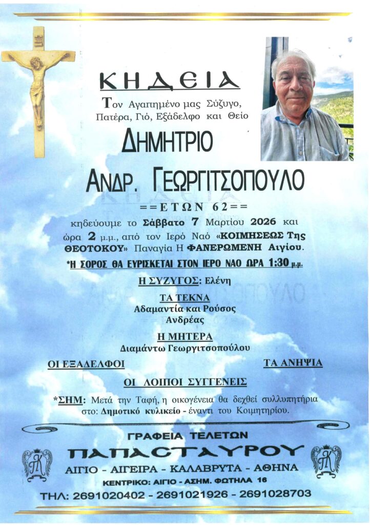 ΑρχικήΑίγιο - Αχαΐα Αίγιο: “Έφυγε” από τη ζωή ο Δημήτριος Γεωργιτσόπουλος και κηδεύεται το Σάββατο 7 Μαρτίου Κηδείες - Μνημόσυνα Από Aigio Voice 5 Μαρτίου 2026 FacebookXWhatsAppEmail TagsΑΙΓΙΟΚΗΔΕΙΑ-ΓΡΑΦΕΙΑ ΤΕΛΕΤΩΝ ΠΑΠΑΣΤΑΥΡΟΥ μερίδιο FacebookXWhatsAppEmail Προηγούμενο άρθροΔΥΤ. ΕΛΛΑΔΑ: Άνοιξε το ευρωπαϊκό πρόγραμμα ACCEND για αιτήσεις εταιρειώνΕπόμενο άρθροΑΙΓΙΑΛΕΙΑ: Στην Αγ. Βαρβάρα πρόεδρος και κάτοικοι κάνουν «θαύματα», αλλά περιμένουν και τον Δήμο… Σχετικά άρθρα Αίγιο - Αχαΐα ΑΙΓΙΑΛΕΙΑ: Στην Αγ. Βαρβάρα πρόεδρος και κάτοικοι κάνουν «θαύματα», αλλά περιμένουν και τον Δήμο… 5 Μαρτίου 2026 Αίγιο - Αχαΐα ΔΥΤ. ΕΛΛΑΔΑ: Άνοιξε το ευρωπαϊκό πρόγραμμα ACCEND για αιτήσεις εταιρειών 5 Μαρτίου 2026 Αίγιο - Αχαΐα Παπασταύρου: Πρώτη γεώτρηση στο Ιόνιο μετά από 50 χρόνια – Το σχέδιο για υδρογονάνθρακες 5 Μαρτίου 2026 - Advertisement - - Advertisement - - Advertisement - - Advertisement - Δείτε ακόμα Αίγιο - Αχαΐα ΑΙΓΙΑΛΕΙΑ: Στην Αγ. Βαρβάρα πρόεδρος και κάτοικοι κάνουν «θαύματα», αλλά περιμένουν και τον Δήμο… Αίγιο - Αχαΐα ΔΥΤ. ΕΛΛΑΔΑ: Άνοιξε το ευρωπαϊκό πρόγραμμα ACCEND για αιτήσεις εταιρειών Αίγιο - Αχαΐα Παπασταύρου: Πρώτη γεώτρηση στο Ιόνιο μετά από 50 χρόνια – Το σχέδιο για υδρογονάνθρακες Αίγιο - Αχαΐα ΠΑΤΡΑ: “Από το σκοτάδι στο Φως – Τριήμερη πρωτοβουλία κοινωνικής ευαισθητοποίησης για την ψυχική υγεία Αίγιο - Αχαΐα ΦΩTO & BINTEO: Ο Δήμος Πατρέων δίνει ζωή σε ένα ακόμη ιστορικό κτήριο – τοπόσημο για την πόλη