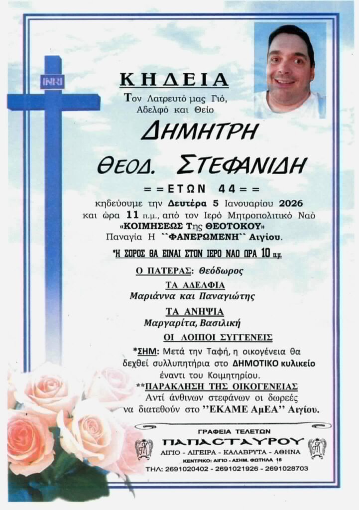 ΑρχικήΑίγιο - Αχαΐα Κηδείες - Μνημόσυνα Αίγιο: “Έφυγε” από τη ζωή ο Δημήτρης Στεφανίδης και κηδεύεται τη Δευτέρα 5 Ιανουαρίου Από Aigio Voice 4 Ιανουαρίου 2026 FacebookTwitterWhatsAppEmail Βρείτε μας στο Google News. Πατήστε εδώ! TagsΑΙΓΙΟΚΗΔΕΙΑ-ΓΡΑΦΕΙΑ ΤΕΛΕΤΩΝ ΠΑΠΑΣΤΑΥΡΟΥ μερίδιο FacebookTwitterWhatsAppEmail Προηγούμενο άρθροΑιτωλοακαρνανία: Δύο συλλήψεις για απόπειρα ανθρωποκτονίας ΑιτωλοακαρνανίαΕπόμενο άρθροΦωτιά σε μεγάλο κέδρο στη Ζαχλωρού – Άμεση κινητοποίηση πυροσβεστικών δυνάμεων από Καλάβρυτα και Αίγιο Aigio Voicehttps://aigiovoice.gr Σχετικά άρθρα Αθλητικά Στους «16» τα φαβορί του Κυπέλλου Ερασιτεχνών Αγροτικά Αγρότες: Νέα κλιμάκωση με 48ωρο αποκλεισμό δρόμων και τελωνείων – Τι αποφάσισαν στη σύσκεψη στα Μάλγαρα Ελλάδα Έφυγε από τη ζωή ο Γιώργος Παπαδάκης ύστερα από έμφραγμα - Advertisement - - Advertisement - - Advertisement - - Advertisement - Δείτε ακόμα Αθλητικά Στους «16» τα φαβορί του Κυπέλλου Ερασιτεχνών Αγροτικά Αγρότες: Νέα κλιμάκωση με 48ωρο αποκλεισμό δρόμων και τελωνείων – Τι αποφάσισαν στη σύσκεψη στα Μάλγαρα Ελλάδα Έφυγε από τη ζωή ο Γιώργος Παπαδάκης ύστερα από έμφραγμα Αίγιο - Αχαΐα Ψήφισμα του Διοικητικού Συμβουλίου του Ε.Κ.Α.ΜΕ./ΑμεΑ Αιγίου για την απώλεια του Δημήτρη Στεφανίδη Αίγιο - Αχαΐα Φωτιά σε μεγάλο κέδρο στη Ζαχλωρού – Άμεση κινητοποίηση πυροσβεστικών δυνάμεων από Καλάβρυτα και Αίγιο