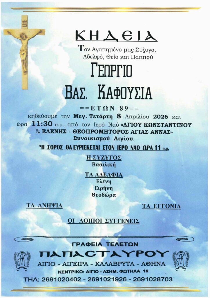 ΑρχικήΑίγιο - Αχαΐα Κηδείες - Μνημόσυνα Αίγιο: “Έφυγε” από τη ζωή ο Γεώργιος Καφούσιας και κηδεύεται την Μ. Τετάρτη 8 Απριλίου Από Aigio Voice 7 Απριλίου 2026 FacebookXWhatsAppEmail Βρείτε μας στο Google News. Πατήστε εδώ! TagsΑΙΓΙΟΚΗΔΕΙΑ-ΓΡΑΦΕΙΑ ΤΕΛΕΤΩΝ ΠΑΠΑΣΤΑΥΡΟΥ μερίδιο FacebookXWhatsAppEmail Προηγούμενο άρθροΔυτική Ελλάδα: Μπαράζ ελέγχων για κάπνισμα σε καταστήματα – Πάνω από 80 παραβάσειςΕπόμενο άρθροΚαιρός Πάσχα: Βροχές από τη Μεγάλη Πέμπτη και Ανάσταση με αρκετό κρύο Aigio Voicehttps://aigiovoice.gr Σχετικά άρθρα Eπιμελητηριακές εκλογές Ανταπόκριση στο κάλεσμα για να πιστοποιηθεί το αχαϊκό ελαιόλαδο Αίγιο - Αχαΐα Ο Δήμαρχος Πατρέων με την Αντιδήμαρχο Υγείας και Πρόνοιας στα ιδρύματα της πόλης Αρθρογραφία Τροπάριο της Κασσιανής : Κατάνυξη και συντριβή μετανοίας. - Advertisement - - Advertisement - - Advertisement - - Advertisement - Δείτε ακόμα Eπιμελητηριακές εκλογές Ανταπόκριση στο κάλεσμα για να πιστοποιηθεί το αχαϊκό ελαιόλαδο Αίγιο - Αχαΐα Ο Δήμαρχος Πατρέων με την Αντιδήμαρχο Υγείας και Πρόνοιας στα ιδρύματα της πόλης Αρθρογραφία Τροπάριο της Κασσιανής : Κατάνυξη και συντριβή μετανοίας. Πολιτική Ομόφωνα υπέρ της άρσης ασυλίας των 11 βουλευτών της ΝΔ για τον ΟΠΕΚΕΠΕ η επιτροπή δεοντολογίας – Την είχαν ζητήσει οι ίδιοι Διεθνή Τουρκία: Ένοπλη επίθεση έξω από το ισραηλινό προξενείο στην Κωνσταντινούπολη (βιντεο)