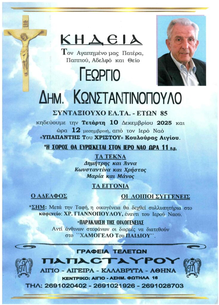 ΑρχικήΑίγιο - Αχαΐα Κηδείες - Μνημόσυνα Αίγιο: “Έφυγε” από τη ζωή ο Γεώργιος Κωνσταντινόπουλος και κηδεύεται την Τετάρτη 10 Δεκεμβρίου Από Aigio Voice 9 Δεκεμβρίου 2025 FacebookTwitterWhatsAppEmail Βρείτε μας στο Google News. Πατήστε εδώ! TagsΑΙΓΙΑΛΕΙΑΑΙΓΙΟΚΗΔΕΙΑ-ΓΡΑΦΕΙΑ ΤΕΛΕΤΩΝ ΠΑΠΑΣΤΑΥΡΟΥ μερίδιο FacebookTwitterWhatsAppEmail Προηγούμενο άρθροΠάτρα: Συλλαλητήριο την άλλη Τρίτη για τον Προϋπολογισμό Aigio Voicehttps://aigiovoice.gr Σχετικά άρθρα Αίγιο - Αχαΐα Πάτρα: Συλλαλητήριο την άλλη Τρίτη για τον Προϋπολογισμό Αγροτικά Πάτρα: Δικογραφία επειδή προσπάθησαν να εισβάλλουν στην περιμετρική παρά τις αστυνομικές υποδείξεις Αυτοκίνητο Αλκοτέστ στα φαρμακεία – «Φυσάνε» πριν κάτσουν στο τιμόνι - Advertisement - - Advertisement - - Advertisement - - Advertisement - Δείτε ακόμα Αίγιο - Αχαΐα Πάτρα: Συλλαλητήριο την άλλη Τρίτη για τον Προϋπολογισμό Αγροτικά Πάτρα: Δικογραφία επειδή προσπάθησαν να εισβάλλουν στην περιμετρική παρά τις αστυνομικές υποδείξεις Αυτοκίνητο Αλκοτέστ στα φαρμακεία – «Φυσάνε» πριν κάτσουν στο τιμόνι Αίγιο - Αχαΐα Πάτρα: Συχνή η εμφάνιση αλεπούδων όπως και σε άλλα αστικά κέντρα Αγροτικά Δ. ΠΑΛΟΥΜΠΗΣ: “Διάλογος-παγίδα για τους αγρότες”