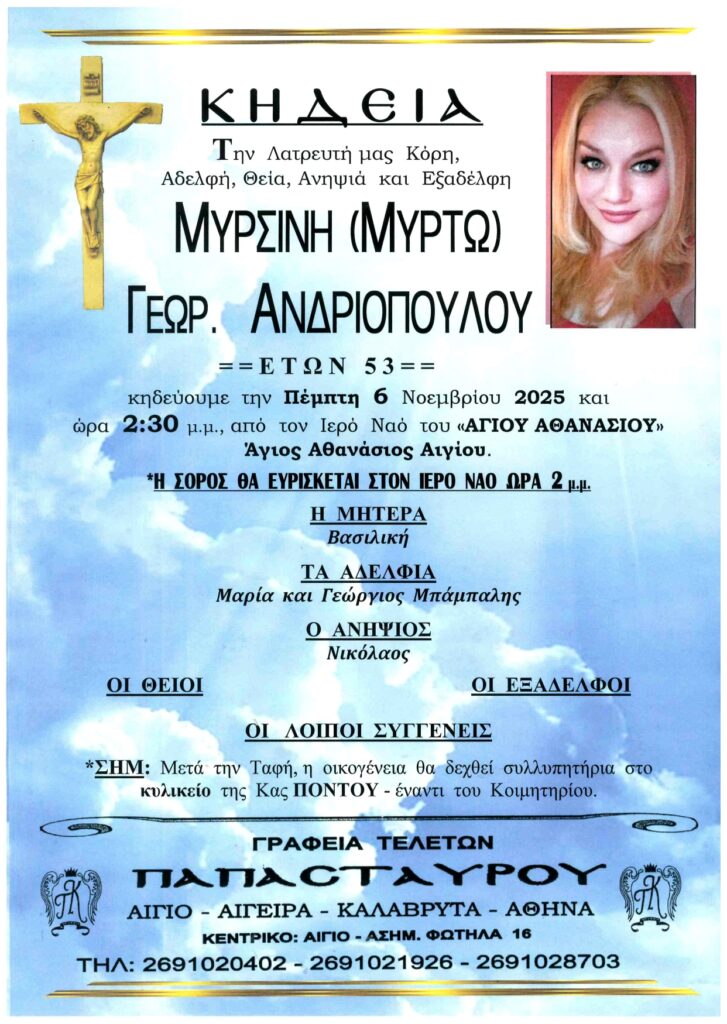 ΑρχικήΑίγιο - Αχαΐα Κηδείες - ΜνημόσυναΚοινωνία ΑΙΓΙΟ: Έφυγε από τη ζωή σε ηλικία 53 ετών η Μυρσίνη (Μυρτώ) Ανδριοπούλου και κηδεύεται την Πέμπτη 6 Νοεμβρίου Από Aigio Voice 4 Νοεμβρίου 2025 FacebookTwitterWhatsAppEmail Βρείτε μας στο Google News. Πατήστε εδώ! TagsΚΗΔΕΙΑ-ΓΡΑΦΕΙΑ ΤΕΛΕΤΩΝ ΠΑΠΑΣΤΑΥΡΟΥ μερίδιο FacebookTwitterWhatsAppEmail Προηγούμενο άρθροΑγρότες και κτηνοτρόφοι στο πλευρό των υγειονομικών – Κάλεσμα συμμετοχής στην Πανυγειονομική ΑπεργίαΕπόμενο άρθροΑίγιο: Κηδεύεται την Πέμπτη 6 Νοεμβρίου η Μαργαρίτα Παπαγιαννοπούλου-Κανελλαΐδου Aigio Voicehttps://aigiovoice.gr Σχετικά άρθρα Αίγιο - Αχαΐα Αίγιο: Κηδεύεται την Πέμπτη 6 Νοεμβρίου η Μαργαρίτα Παπαγιαννοπούλου-Κανελλαΐδου Αγροτικά Αγρότες και κτηνοτρόφοι στο πλευρό των υγειονομικών – Κάλεσμα συμμετοχής στην Πανυγειονομική Απεργία Οικονομία ΑΑΔΕ: Σαφάρι ελέγχων στα νυχτερινά κέντρα με αλγόριθμους και social media - Advertisement - - Advertisement - - Advertisement - - Advertisement - Δείτε ακόμα Αίγιο - Αχαΐα Αίγιο: Κηδεύεται την Πέμπτη 6 Νοεμβρίου η Μαργαρίτα Παπαγιαννοπούλου-Κανελλαΐδου Αγροτικά Αγρότες και κτηνοτρόφοι στο πλευρό των υγειονομικών – Κάλεσμα συμμετοχής στην Πανυγειονομική Απεργία Οικονομία ΑΑΔΕ: Σαφάρι ελέγχων στα νυχτερινά κέντρα με αλγόριθμους και social media Αίγιο - Αχαΐα Τ. Παπαδόπουλος: «Η Περιφέρεια Δυτικής Ελλάδας και το Πανεπιστήμιο Πατρών ενδυναμώνουν την εξωστρέφεια της Δυτικής Ελλάδας Αίγιο - Αχαΐα ΠΑΤΡΑ: Πρόβλημα σε αγωγό – Χωρίς νερό αύριο μεγάλο μέρος του κέντρο της πόλης