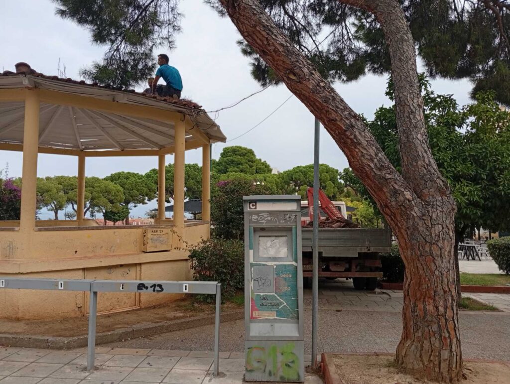Η εντολή δόθηκε και οι εργασίες επισκευής ξεκίνησαν από τη βάση μέχρι και τα κεραμίδια. Και το κιόσκι θα αποδοθεί όπως πριν, ανανεωμένο και λειτουργικό!