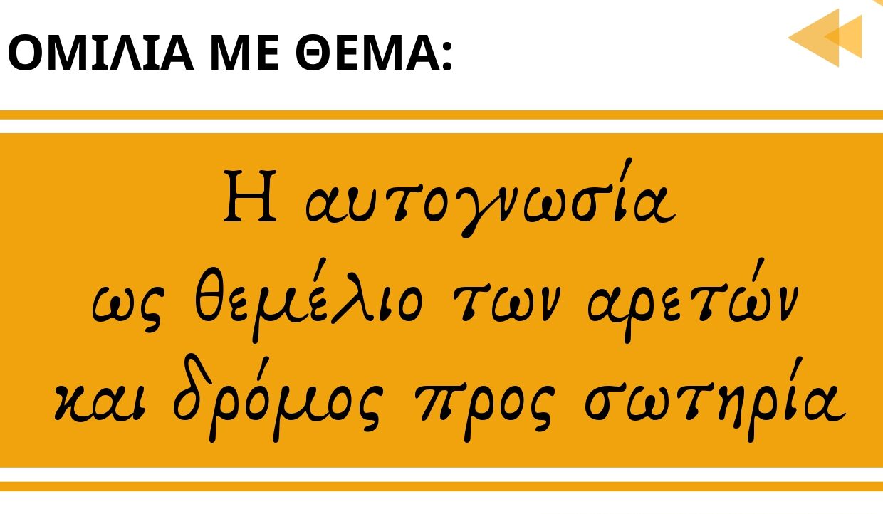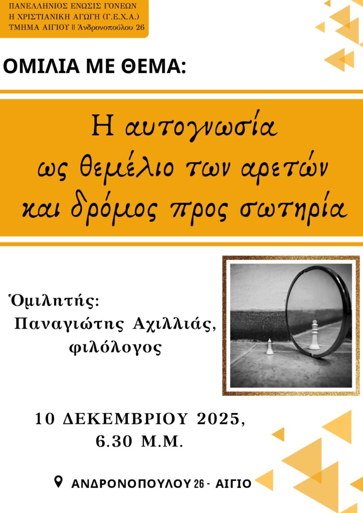 Μια ιδιαίτερα ενδιαφέρουσα ομιλία με θέμα «Η αυτογνωσία ως θεμέλιο των αρετών και δρόμος προς σωτηρία» θα πραγματοποιηθεί την Τετάρτη 10 Δεκεμβρίου 2025, στις 6.30 μ.μ., της Πανελλήνιας Ένωσης Γονέων «Η Χριστιανική Αγωγή» (Π.Ε.Χ.Α), στην οδό Ανδρονοπούλου 26 στο Αίγιο.
