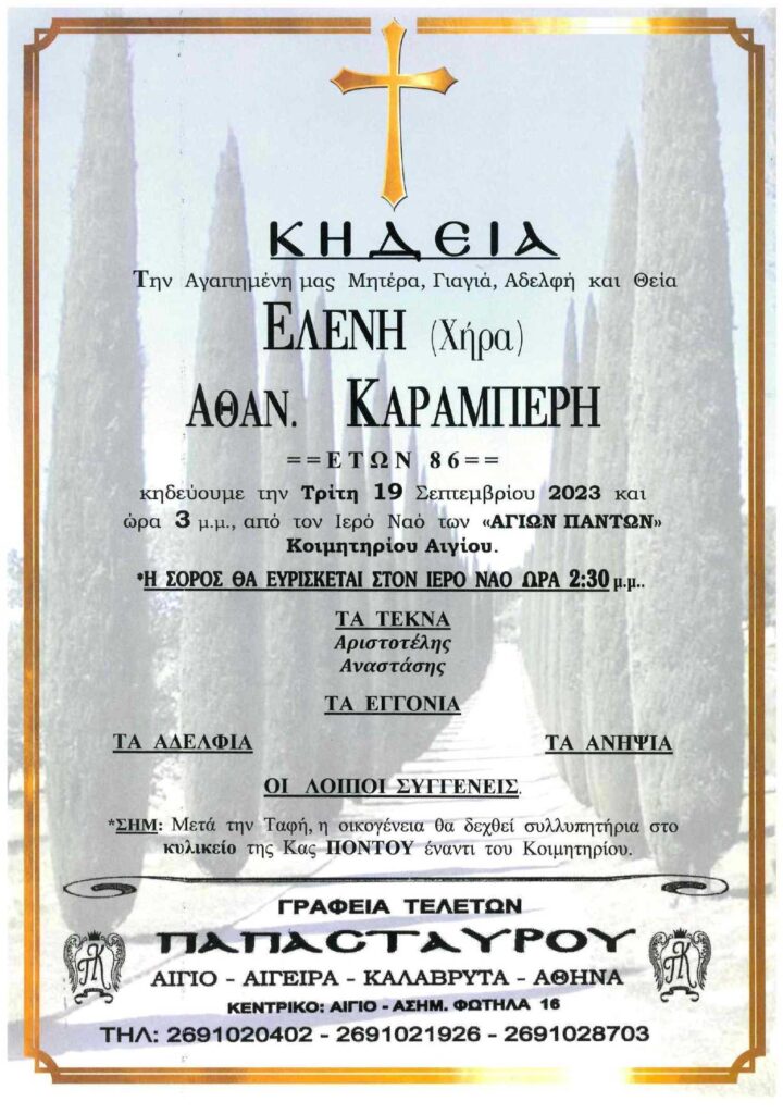 ΑρχικήΚηδείες - Μνημόσυνα Κηδείες - Μνημόσυνα Αίγιο: Κηδεύεται αύριο Τρίτη 19 Σεπτεμβρίου η Ελένη Καραμπέρη Από Aigio Voice 18 Σεπτεμβρίου 2023 FacebookXWhatsAppEmail Βρείτε μας στο Google News. Πατήστε εδώ! TagsΚΗΔΕΙΑ-ΓΡΑΦΕΙΑ ΤΕΛΕΤΩΝ ΠΑΠΑΣΤΑΥΡΟΥ μερίδιο FacebookXWhatsAppEmail Προηγούμενο άρθροΛιβύη: Πέντε οι Έλληνες νεκροί από το φρικτό τροχαίο -Τρεις στρατιωτικοί και δύο διερμηνείςΕπόμενο άρθροΑίγιο: Εργαστήρια χειροτεχνίας για ενήλικες από τη ΔΗ.Κ.Ε.Π.Α. – Πρώτες συναντήσεις σε Αίγιο και Τράπεζα Aigio Voicehttps://aigiovoice.gr Σχετικά άρθρα Ελλάδα Κατάργηση φοροαπαλλαγών προτείνει η Τράπεζα της Ελλάδος Ελλάδα Τουρισμός: Θετική δυναμική παρά την κρίση στη Μ. Ανατολή Πολιτική Κώστας Τσουκαλάς: «Ο κ. Γεωργιάδης για ακόμη μία φορά είναι ο “λαγός” του Κυριάκου Μητσοτάκη - Advertisement - - Advertisement - - Advertisement - - Advertisement - Δείτε ακόμα Ελλάδα Κατάργηση φοροαπαλλαγών προτείνει η Τράπεζα της Ελλάδος Ελλάδα Τουρισμός: Θετική δυναμική παρά την κρίση στη Μ. Ανατολή Πολιτική Κώστας Τσουκαλάς: «Ο κ. Γεωργιάδης για ακόμη μία φορά είναι ο “λαγός” του Κυριάκου Μητσοτάκη Αίγιο - Αχαΐα Κατάλογος Ηλείων αγωνιστών που συμμετείχαν στην Α΄ πολιορκία του Μεσολογγίου Κοινωνία Σε εξέλιξη η υποβολή αιτήσεων από δικαιούχους του Youth Pass 2026 – Πώς πιστώνονται τα 150 ευρώ