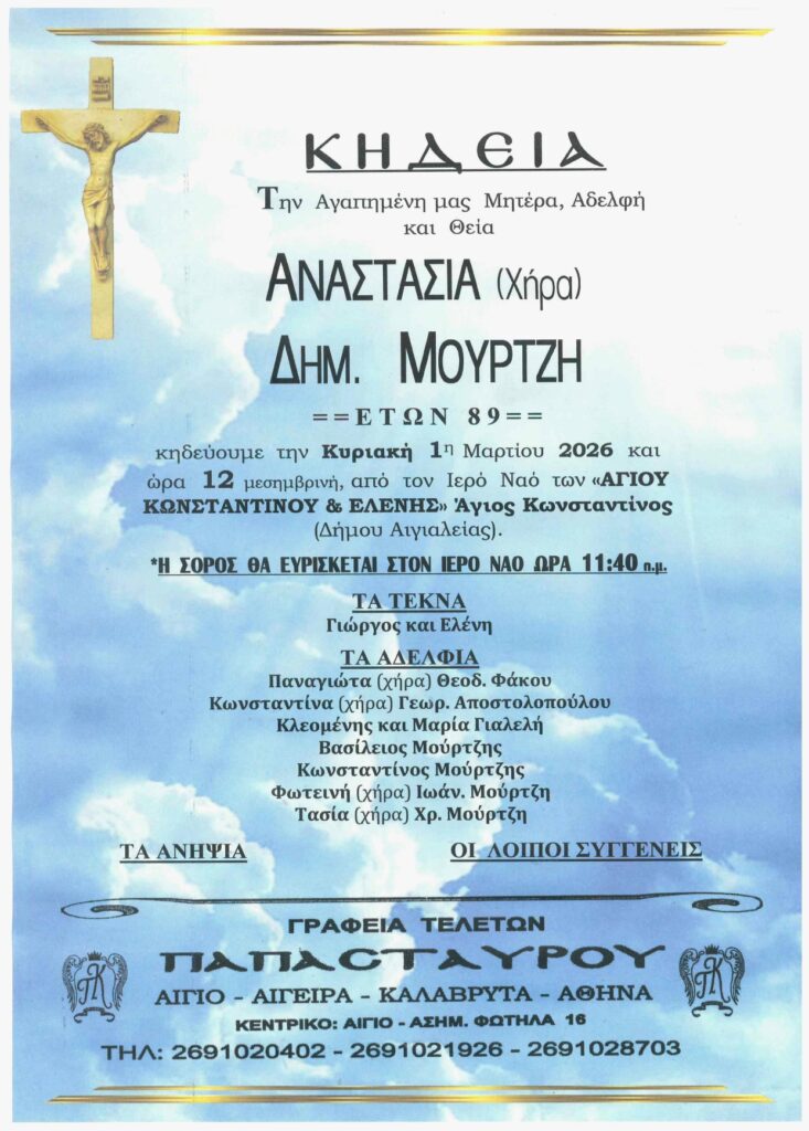 ΑρχικήΑίγιο - Αχαΐα Κηδείες - Μνημόσυνα ΑΙΓΙΟ: Κηδεύεται την Κυριακή 1η Μαρτίου η Αναστασία Μούρτζη Από Aigio Voice 27 Φεβρουαρίου 2026 FacebookXWhatsAppEmail Βρείτε μας στο Google News. Πατήστε εδώ! TagsΑΙΓΙΟΚΗΔΕΙΑ-ΓΡΑΦΕΙΑ ΤΕΛΕΤΩΝ ΠΑΠΑΣΤΑΥΡΟΥ μερίδιο FacebookXWhatsAppEmail Προηγούμενο άρθροΑπεργία ΠΝΟ: Δεμένα τα πλοία το Σάββατο 28 Φεβρουαρίου Aigio Voicehttps://aigiovoice.gr Σχετικά άρθρα Αίγιο - Αχαΐα Απεργία ΠΝΟ: Δεμένα τα πλοία το Σάββατο 28 Φεβρουαρίου Αίγιο - Αχαΐα Αντώνης Ποταμίτης: «Ο κ. Λουλούδης είναι αδιόρθωτος – Αντί να δώσει απαντήσεις για τις παράνομες δαπάνες, τις “βάφτισε” κανονικότητα»! Αίγιο - Αχαΐα ΠΑΤΡΑ: 119 Προσλήψεις στην Καθαριότητα – Το σχέδιο για καθαρότερη πόλη - Advertisement - - Advertisement - - Advertisement - - Advertisement - Δείτε ακόμα Αίγιο - Αχαΐα Απεργία ΠΝΟ: Δεμένα τα πλοία το Σάββατο 28 Φεβρουαρίου Αίγιο - Αχαΐα Αντώνης Ποταμίτης: «Ο κ. Λουλούδης είναι αδιόρθωτος – Αντί να δώσει απαντήσεις για τις παράνομες δαπάνες, τις “βάφτισε” κανονικότητα»! Αίγιο - Αχαΐα ΠΑΤΡΑ: 119 Προσλήψεις στην Καθαριότητα – Το σχέδιο για καθαρότερη πόλη Ελλάδα Λουτράκι: Συνελήφθη ο φερόμενος δράστης της φονικής συμπλοκής με θύμα τον 17χρονο Διεθνή ΥΠΕΞ: Συνιστά στους Έλληνες πολίτες την αποφυγή επισκέψεων σε Ισραήλ, παλαιστινιακά εδάφη και Ιράν