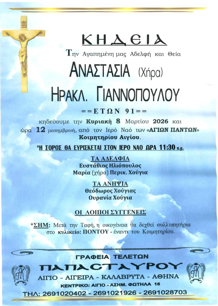 ΑρχικήΑίγιο - Αχαΐα Κηδείες - Μνημόσυνα ΑΙΓΙΟ: Κηδεύεται την Κυριακή 8 Μαρτίου η Αναστασία Γιαννοπούλου Από Aigio Voice 7 Μαρτίου 2026 FacebookXWhatsAppEmail Βρείτε μας στο Google News. Πατήστε εδώ! TagsΑΙΓΙΟΚΗΔΕΙΑ-ΓΡΑΦΕΙΑ ΤΕΛΕΤΩΝ ΠΑΠΑΣΤΑΥΡΟΥ μερίδιο FacebookXWhatsAppEmail Προηγούμενο άρθρο«Η ξεφτίλα δεν έχει όρια»: Η Σοφία Μητσοτάκη απαντά στα fake news για την επιστροφή της από το Ντουμπάι Aigio Voicehttps://aigiovoice.gr Σχετικά άρθρα Ελλάδα «Η ξεφτίλα δεν έχει όρια»: Η Σοφία Μητσοτάκη απαντά στα fake news για την επιστροφή της από το Ντουμπάι Αίγιο - Αχαΐα ΑΙΓΙΟ: Ημερίδα για την Οργάνωση και τη Διαχείριση των Πολιτιστικών Συλλόγων Αίγιο - Αχαΐα ΑΙΓΙΟ: Κηδεύεται την Κυριακή 8 Μαρτίου ο Κωνσταντίνος Καραμπούλης - Advertisement - - Advertisement - - Advertisement - - Advertisement - Δείτε ακόμα Ελλάδα «Η ξεφτίλα δεν έχει όρια»: Η Σοφία Μητσοτάκη απαντά στα fake news για την επιστροφή της από το Ντουμπάι Αίγιο - Αχαΐα ΑΙΓΙΟ: Ημερίδα για την Οργάνωση και τη Διαχείριση των Πολιτιστικών Συλλόγων Αίγιο - Αχαΐα ΑΙΓΙΟ: Κηδεύεται την Κυριακή 8 Μαρτίου ο Κωνσταντίνος Καραμπούλης Αίγιο - Αχαΐα ΔΗΜΟΣ ΠΑΤΡΕΩΝ: Δημοτική Επιτροπή την Τρίτη Ελλάδα Τραγωδία στην Τρίπολη: Αστυνομικός βρέθηκε νεκρή από πυροβολισμό στο σπίτι της