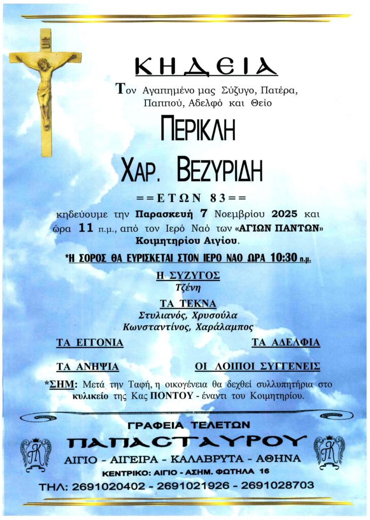 Αίγιο: Κηδεύεται την Παρασκευή 7 Νοεμβρίου ο Περικλής Βεζυρίδης