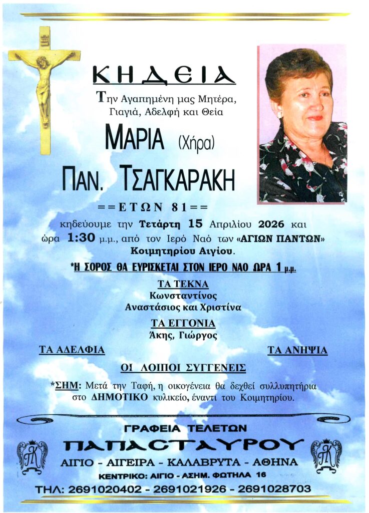 ΑρχικήΑίγιο - Αχαΐα Κηδείες - Μνημόσυνα ΑΙΓΙΟ: Κηδεύεται την Τετάρτη 15 Απριλίου η Μαρία Τσαγκαράκη Από Aigio Voice 13 Απριλίου 2026 FacebookXWhatsAppEmail Βρείτε μας στο Google News. Πατήστε εδώ! TagsΑΙΓΙΟΚΗΔΕΙΑ-ΓΡΑΦΕΙΑ ΤΕΛΕΤΩΝ ΠΑΠΑΣΤΑΥΡΟΥ μερίδιο FacebookXWhatsAppEmail Προηγούμενο άρθροΠάτρα: Πλήθος πιστών στον Άγιο Ανδρέα για την Αγάπη (φωτο) Aigio Voicehttps://aigiovoice.gr Σχετικά άρθρα Αίγιο - Αχαΐα Πάτρα: Πλήθος πιστών στον Άγιο Ανδρέα για την Αγάπη (φωτο) Αίγιο - Αχαΐα ΠΑΤΡΑ: Σύλληψη για ηχορύπανση Αίγιο - Αχαΐα Πάτρα: Του φόρεσαν χειροπέδες γιατί αρνήθηκε το αλκοτέστ - Advertisement - - Advertisement - - Advertisement - - Advertisement - Δείτε ακόμα Αίγιο - Αχαΐα Πάτρα: Πλήθος πιστών στον Άγιο Ανδρέα για την Αγάπη (φωτο) Αίγιο - Αχαΐα ΠΑΤΡΑ: Σύλληψη για ηχορύπανση Αίγιο - Αχαΐα Πάτρα: Του φόρεσαν χειροπέδες γιατί αρνήθηκε το αλκοτέστ Κοινωνία Πλειστηριασμοί: Στο σφυρί ακίνητα από 1.000 ευρώ έως 2,5 εκατ. βγάζει η εφορία Αίγιο - Αχαΐα ΑΧΑΪΑ: Συλλήψεις για κατοχή κοκαϊνης