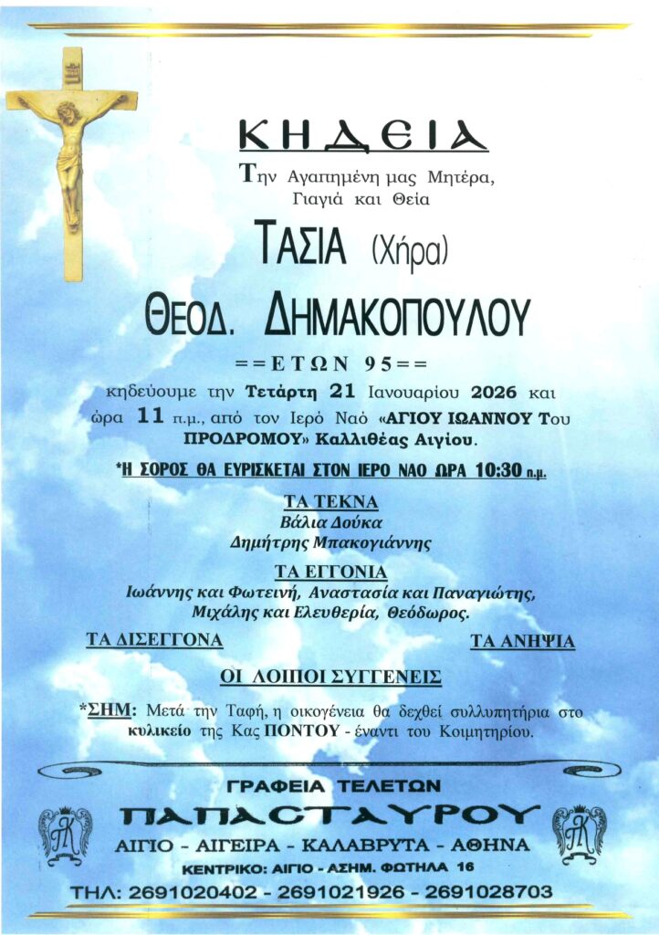 ΑρχικήΑίγιο - Αχαΐα Κηδείες - Μνημόσυνα ΑΙΓΙΟ: Κηδεύεται την Τετάρτη 21 Ιανουαρίου η Τασία Δημακοπούλου Από Aigio Voice 19 Ιανουαρίου 2026 FacebookTwitterWhatsAppEmail Βρείτε μας στο Google News. Πατήστε εδώ! TagsΑΙΓΙΟΚΗΔΕΙΑ-ΓΡΑΦΕΙΑ ΤΕΛΕΤΩΝ ΠΑΠΑΣΤΑΥΡΟΥ μερίδιο FacebookTwitterWhatsAppEmail Προηγούμενο άρθροΥΠΕΝ: 42 έργα αντιμετώπισης της λειψυδρίας άνω των 75 εκατ. ευρώ σε όλη τη χώρα Aigio Voicehttps://aigiovoice.gr Σχετικά άρθρα Ελλάδα ΥΠΕΝ: 42 έργα αντιμετώπισης της λειψυδρίας άνω των 75 εκατ. ευρώ σε όλη τη χώρα Εργασιακά Αντίστροφη μέτρηση για το νέο επίδομα ανεργίας Οικονομία Ακρίβεια σε τρόφιμα και υπηρεσίες έως το 2028 βλέπει η Τράπεζα της Ελλάδος - Advertisement - - Advertisement - - Advertisement - - Advertisement - Δείτε ακόμα Ελλάδα ΥΠΕΝ: 42 έργα αντιμετώπισης της λειψυδρίας άνω των 75 εκατ. ευρώ σε όλη τη χώρα Εργασιακά Αντίστροφη μέτρηση για το νέο επίδομα ανεργίας Οικονομία Ακρίβεια σε τρόφιμα και υπηρεσίες έως το 2028 βλέπει η Τράπεζα της Ελλάδος Οικονομία Συντάξεις 2026: Πώς θα υπολογιστούν τα νέα ποσά ανά έτος ασφάλισης Αθλητικά Στις εξέδρες του “Φ. Αραβαντινός” άνθρωποι του Παναιγιαλείου