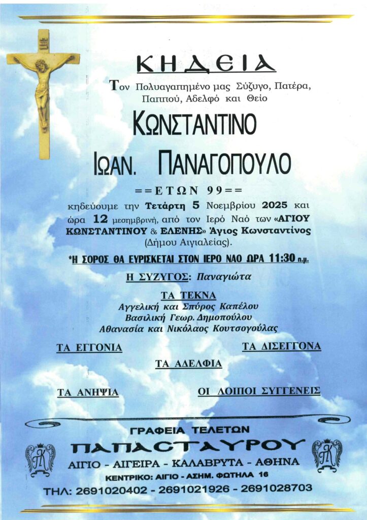 ΑρχικήΑίγιο - Αχαΐα Κηδείες - ΜνημόσυναΚοινωνία Αίγιο: Κηδεύεται την Τετάρτη 5 Νοεμβρίου ο Κωνσταντίνος Παναγόπουλος Από Aigio Voice 3 Νοεμβρίου 2025 FacebookTwitterWhatsAppEmail Βρείτε μας στο Google News. Πατήστε εδώ! TagsΚΗΔΕΙΑ-ΓΡΑΦΕΙΑ ΤΕΛΕΤΩΝ ΠΑΠΑΣΤΑΥΡΟΥ μερίδιο FacebookTwitterWhatsAppEmail Προηγούμενο άρθροΠΑΤΡΑ: Πρόστιμο σε επιχείρηση γιατί άφησε υπολείμματα τροφίμων έξω από κάδους ανακύκλωσηςΕπόμενο άρθροΠΑΤΡΑ: Ειδικούς κάδους για τα τηγανέλαια τοποθέτησε ο Δήμος Aigio Voicehttps://aigiovoice.gr Σχετικά άρθρα Αυτοκίνητο Αναρτήθηκαν τα τέλη κυκλοφορίας του 2026 Αθλητικά Η νέα γενιά της “Μαύρης Θύελλας” ξεκινά – Γεννιέται η Κ19! Αίγιο - Αχαΐα ΔΕΕΠ ΝΔ ΑΧΑΪΑΣ: 4 χρόνια Δράσεις παντού και επιτυχή αποτελέσματα – Ένας μίνι απολογισμός… - Advertisement - - Advertisement - - Advertisement - - Advertisement - Δείτε ακόμα Αυτοκίνητο Αναρτήθηκαν τα τέλη κυκλοφορίας του 2026 Αθλητικά Η νέα γενιά της “Μαύρης Θύελλας” ξεκινά – Γεννιέται η Κ19! Αίγιο - Αχαΐα ΔΕΕΠ ΝΔ ΑΧΑΪΑΣ: 4 χρόνια Δράσεις παντού και επιτυχή αποτελέσματα – Ένας μίνι απολογισμός… Αίγιο - Αχαΐα Ο Σάκης Μεντζελόπουλος στο πλευρό του Αντώνη Κουνάβη Αίγιο - Αχαΐα Παρουσίαση του Τεχνικού Προγράμματος 2026 του Δήμου Αιγιαλείας