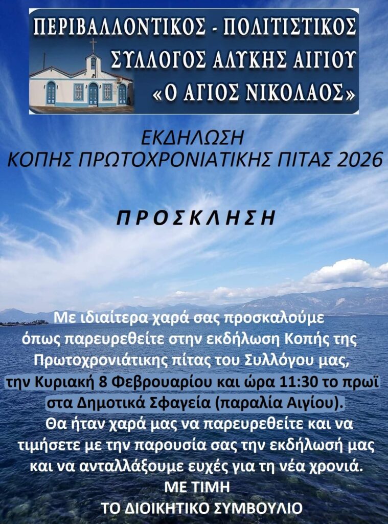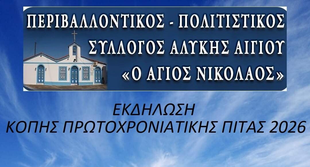 Ο Πρόεδρος και το Διοικητικό Συμβούλιο του Συλλόγου Αλυκής, σας προσκαλούν να παραβρεθείτε στην εκδήλωση κοπής της πρωτοχρονιάτικης πίτας του Συλλόγου μας, η οποία θα πραγματοποιηθεί την Κυριακή 8 Φεβρουαρίου και ώρα 11:30 το πρωί,