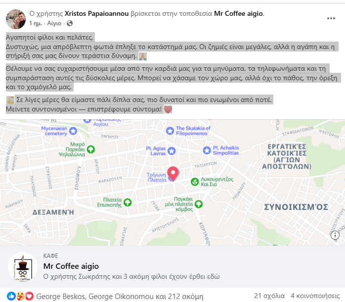 Ένα συγκινητικό Ευχαριστήριο δημοσίευσε ο Χρήστος Παπαϊωάννου μετά τη φωτιά που εκδηλώθηκε στο κατάστημά του Mr Coffee στο Αίιγο ΔΕΙΤΕ ΡΕΠΟΡΤΑΖ ΕΔΩ: https://www.aigiovoice.gr/aigio-fotia-se-katastima-kafe-stin-trigoni-plateia-se-exelixi-i-epicheirisi-tis-pyrosvestikis-foto-vinteo/. Επισημαίνοντας ότι παρά την καταστροφή, η αγάπη του κόσμου του δίνει δύναμη…