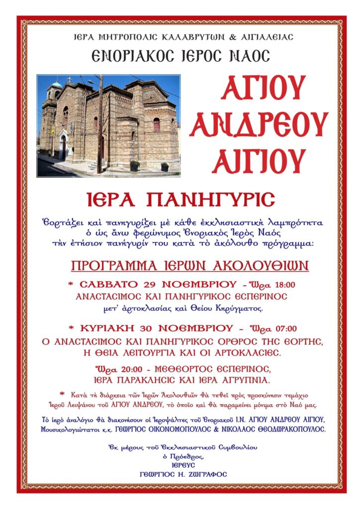 Με εκκλησιαστική λαμπρότητα και κατάνυξη θα τιμηθεί και φέτος η μνήμη του Αγίου Ανδρέου στο Αίγιο, όπου ο φερώνυμος ενοριακός Ιερός Ναός διοργανώνει την καθιερωμένη ετήσια πανήγυρη. Το πρόγραμμα των λατρευτικών εκδηλώσεων ανακοινώθηκε επίσημα από την Ιερά Μητρόπολη Καλαβρύτων και Αιγιαλείας, προσκαλώντας τους πιστούς να συμμετάσχουν στις ιδιαίτερα σημαντικές αυτές στιγμές της τοπικής Εκκλησίας.