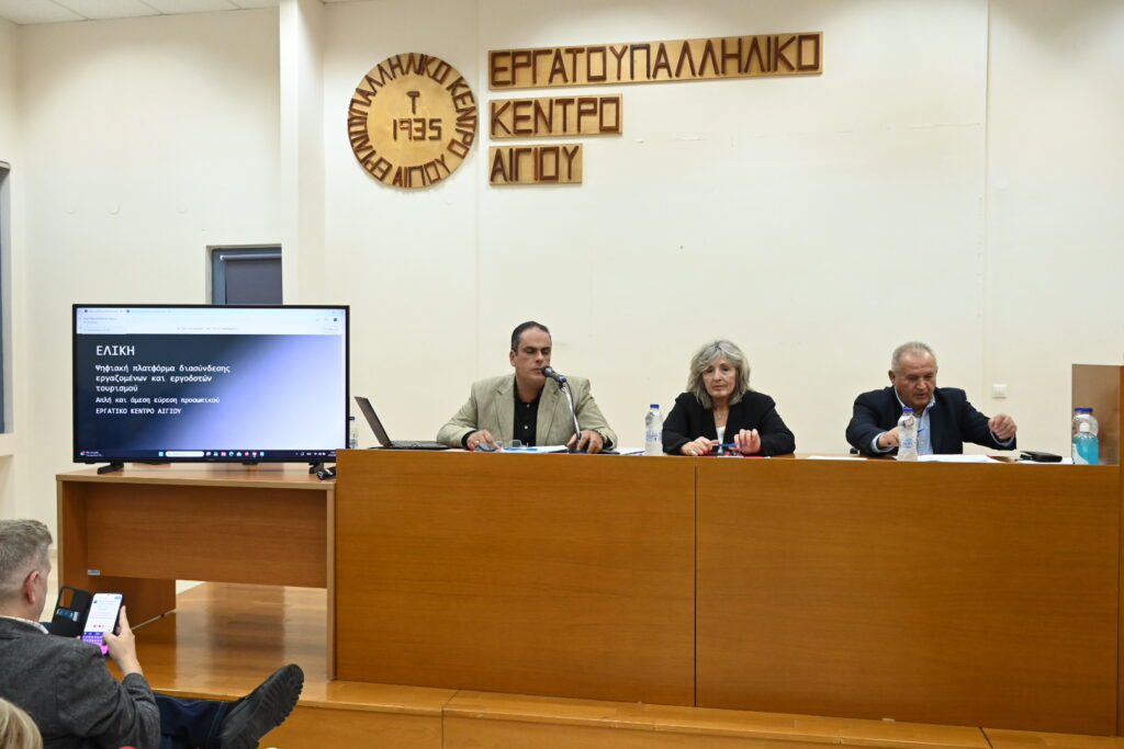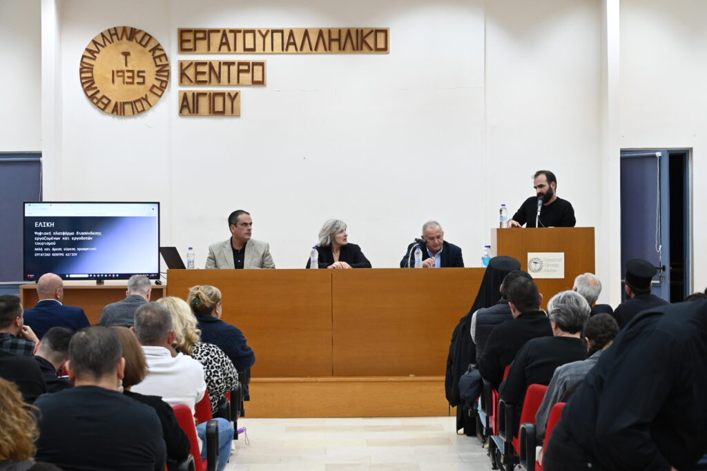 Κατά τη διάρκεια της ημερίδας παρουσιάστηκε ο μηχανισμός ψηφιακής πλατφόρμας “ΕΛΙΚΗ”, θεσμικής διασύνδεσης εργαζομένων και εργοδοτών που δημιουργήθηκε από το Εργατικό Κέντρο Αιγίου, με στόχο τη διατήρηση της απασχόλησης, τη στήριξη της τοπικής οικονομίας και την ενίσχυση της κοινωνικής συνοχής. Παράλληλα, δόθηκε έμφαση στη στήριξη της νεανικής απασχόλησης, με τη συμμετοχή φοιτητών τουριστικών σχολών, οι οποίοι είχαν την ευκαιρία να γνωρίσουν από κοντά τις ανάγκες της αγοράς εργασίας και να συνδεθούν με επιχειρήσεις του κλάδου.