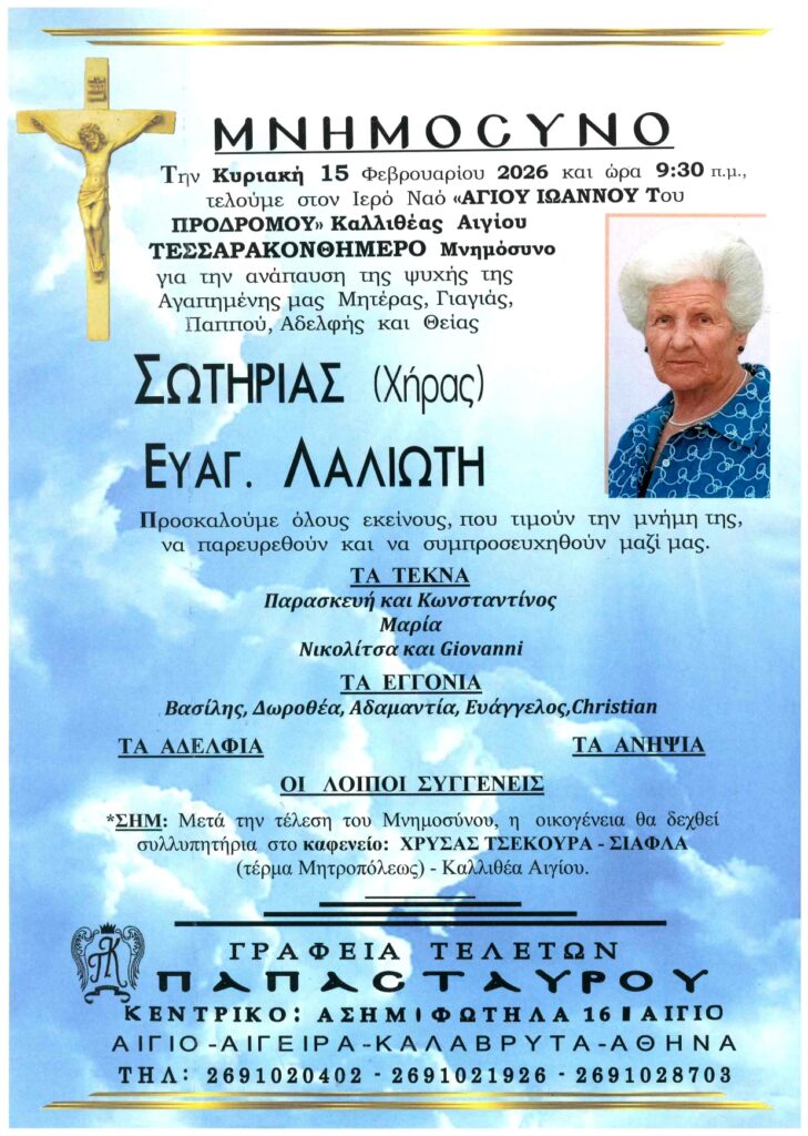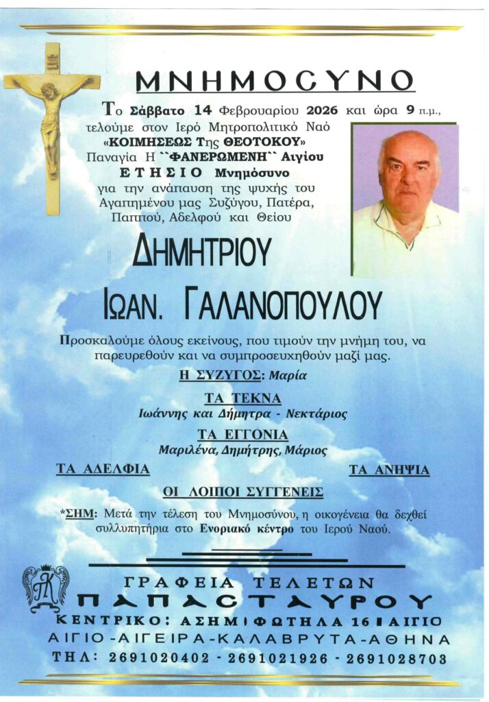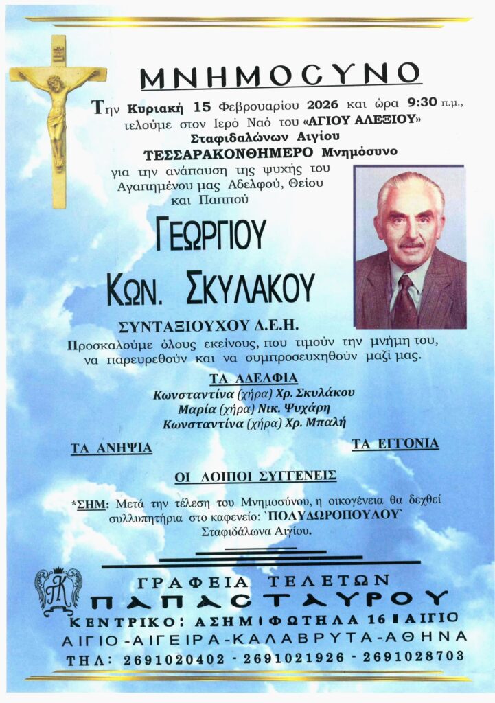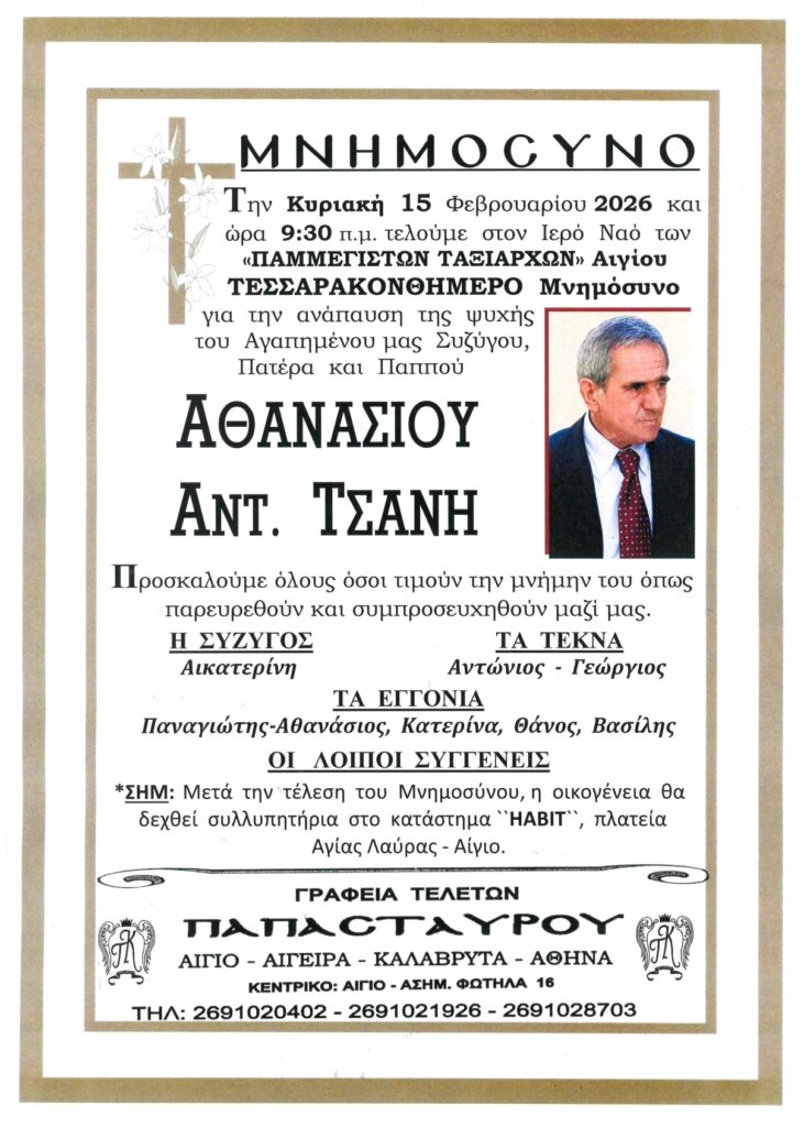 ΑρχικήΑίγιο - Αχαΐα Κηδείες - Μνημόσυνα ΑΙΓΙΟ: Μνημόσυνα που θα τελεστούν το Σάββατο 14 και την Κυριακή 15 Φεβρουαρίου Από Aigio Voice 11 Φεβρουαρίου 2026 FacebookTwitterWhatsAppEmail Βρείτε μας στο Google News. Πατήστε εδώ! TagsΑΙΓΙΑΛΕΙΑΑΙΓΙΟΜΝΗΜΟΣΥΝΑ-ΓΡΑΦΕΙΑ ΤΕΛΕΤΩΝ ΠΑΠΑΣΤΑΥΡΟΥ μερίδιο FacebookTwitterWhatsAppEmail Προηγούμενο άρθροΟΔΟΝΤΩΤΟΣ: Αίσιο τέλος για τους 85 εγκλωβισμένους – Καθοριστικός ο ρόλος της Πυροσβεστικής Αιγίου Aigio Voicehttps://aigiovoice.gr Σχετικά άρθρα Αίγιο - Αχαΐα ΟΔΟΝΤΩΤΟΣ: Αίσιο τέλος για τους 85 εγκλωβισμένους – Καθοριστικός ο ρόλος της Πυροσβεστικής Αιγίου Κοινωνία Τράπεζες: «Προειδοποίηση» Moody’s μετά την απόφαση του Αρείου Πάγου Αίγιο - Αχαΐα ΟΔΟΝΤΩΤΟΣ: Καθηλώθηκε και η δεύτερη αμαξοστοιχία που έσπευσε για βοήθεια - Advertisement - - Advertisement - - Advertisement - - Advertisement - Δείτε ακόμα Αίγιο - Αχαΐα ΟΔΟΝΤΩΤΟΣ: Αίσιο τέλος για τους 85 εγκλωβισμένους – Καθοριστικός ο ρόλος της Πυροσβεστικής Αιγίου Κοινωνία Τράπεζες: «Προειδοποίηση» Moody’s μετά την απόφαση του Αρείου Πάγου Αίγιο - Αχαΐα ΟΔΟΝΤΩΤΟΣ: Καθηλώθηκε και η δεύτερη αμαξοστοιχία που έσπευσε για βοήθεια Αίγιο - Αχαΐα ΔΙΗΜΕΡΟΣ “ΚΟΚΚΙΝΟΣ ΣΥΝΑΓΕΡΜΟΣ” ΣΕ ΑΧΑΪΑ – ΗΛΕΙΑ | Αναμένεται σφοδρό κύμα κακοκαιρίας Πολιτική ΝΙΚΟΛΟΠΟΥΛΟΣ: Η Αριστερά με τη Δεξιά… βάζουν το δάχτυλο στο μέλι και, ενίοτε, παίρνουν όλο το βάζο.