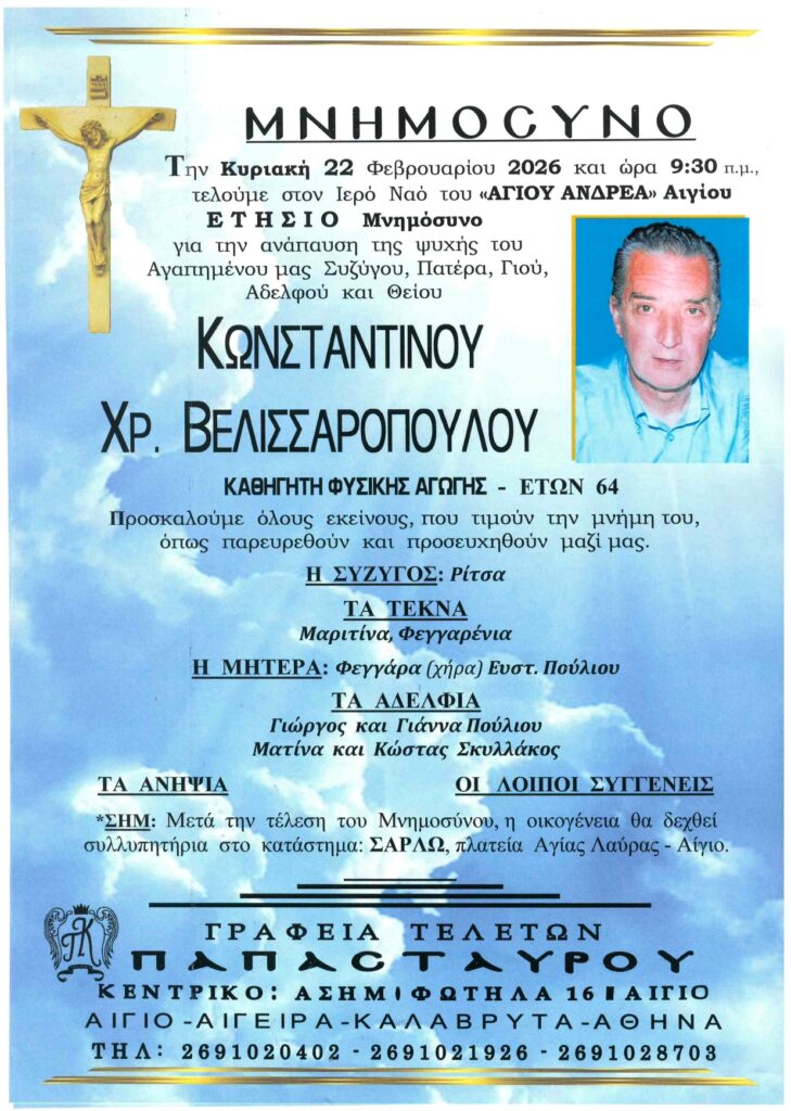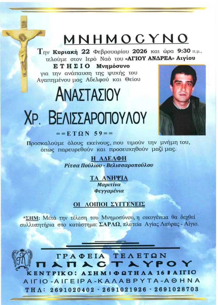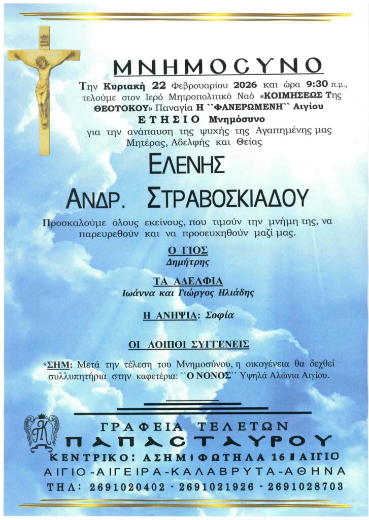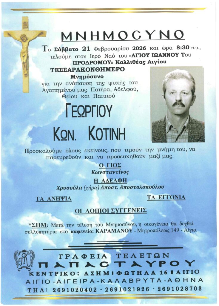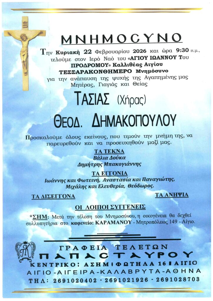 ΑρχικήΑίγιο - Αχαΐα Κηδείες - Μνημόσυνα ΑΙΓΙΟ: Μνημόσυνα που θα τελεστούν το Σάββατο 21 και την Κυριακή 22 Φεβρουαρίου Από Aigio Voice 19 Φεβρουαρίου 2026 FacebookTwitterWhatsAppEmail Βρείτε μας στο Google News. Πατήστε εδώ! TagsΑΙΓΙΑΛΕΙΑΑΙΓΙΟΜΝΗΜΟΣΥΝΑ-ΓΡΑΦΕΙΑ ΤΕΛΕΤΩΝ ΠΑΠΑΣΤΑΥΡΟΥ μερίδιο FacebookTwitterWhatsAppEmail Προηγούμενο άρθροΗ γραμμή Διακοπτό-Αίγιο στα “χέρια” της ΠΔΕ – Ευοδώθηκαν οι προσπάθειες ΖαΐμηΕπόμενο άρθροΠΑΤΡΑ: Μαζικό κάλεσμα στη συγκέντρωση για τα Τέμπη από το Εργατικό Κέντρο Aigio Voicehttps://aigiovoice.gr Σχετικά άρθρα Αίγιο - Αχαΐα ΠΑΤΡΑ: Μαζικό κάλεσμα στη συγκέντρωση για τα Τέμπη από το Εργατικό Κέντρο Αίγιο - Αχαΐα Η γραμμή Διακοπτό-Αίγιο στα “χέρια” της ΠΔΕ – Ευοδώθηκαν οι προσπάθειες Ζαΐμη Αίγιο - Αχαΐα Όλη η Πάτρα στα άρματα! Αύριο η παρέλαση… - Advertisement - - Advertisement - - Advertisement - - Advertisement - Δείτε ακόμα Αίγιο - Αχαΐα ΠΑΤΡΑ: Μαζικό κάλεσμα στη συγκέντρωση για τα Τέμπη από το Εργατικό Κέντρο Αίγιο - Αχαΐα Η γραμμή Διακοπτό-Αίγιο στα “χέρια” της ΠΔΕ – Ευοδώθηκαν οι προσπάθειες Ζαΐμη Αίγιο - Αχαΐα Όλη η Πάτρα στα άρματα! Αύριο η παρέλαση… Αίγιο - Αχαΐα Κυκλοφοριακές Ρυθμίσεις | Καρναβάλι Πάτρας 2026 Αίγιο - Αχαΐα Δυτική Αχαϊα: Καρναβαλικές βραβεύσεις σε Μαθητές – Αύριο η κορύφωση