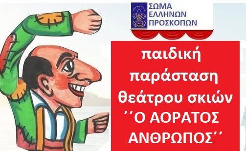 Το 4ο Σύστημα Αεροπροσκόπων Αιγίου διοργανώνει παράσταση Καραγκιόζη, για μαθητές Δημοτικού, το προσεχές Σάββατο 29 Νοεμβρίου και ώρα 18:00μ.μ. στην αίθουσα τελετών του 6ου Δημοτικού Σχολείου, στις Εργατικές Κατοικίες Αγίου Αθανασίου Αιγίου. ”Ο αόρατος άνθρωπος” έρχεται να αναστατώσει τον Καραγκιόζη και να χαρίσει σε όλους μας κέφι, χαρά και πολύ γέλιο. ΕΙΣΟΔΟΣ ΕΛΕΥΘΕΡΗ.