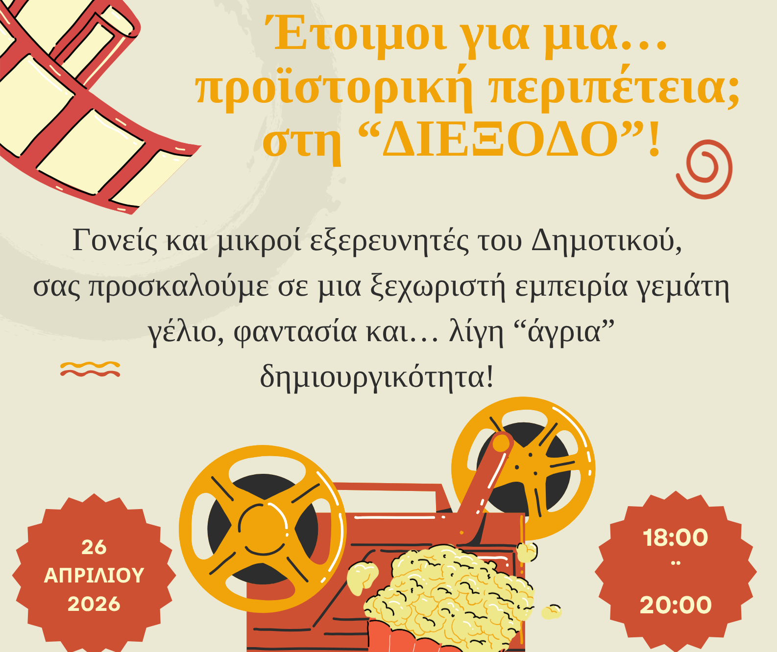 Οι οικογένειες θα έχουν τη δυνατότητα να ταξιδέψουν σε έναν φανταστικό προϊστορικό κόσμο γεμάτο χρώματα, περιπέτεια και απρόσμενες συναντήσεις. Μια αξιαγάπητη οικογένεια ανακαλύπτει νέες ιδέες, νέους φίλους και έναν κόσμο που κρύβει αμέτρητες εκπλήξεις. Μετά την προβολή ταινίας θα ακολουθήσει συζήτηση και βιωματικές δραστηριότητες προσφέροντας στα μέλη της οικογένειας την ευκαιρία να ψυχαγωγηθούν, να γνωριστούν καλύτερα και να μοιραστούν σκέψεις και συναισθήματα.