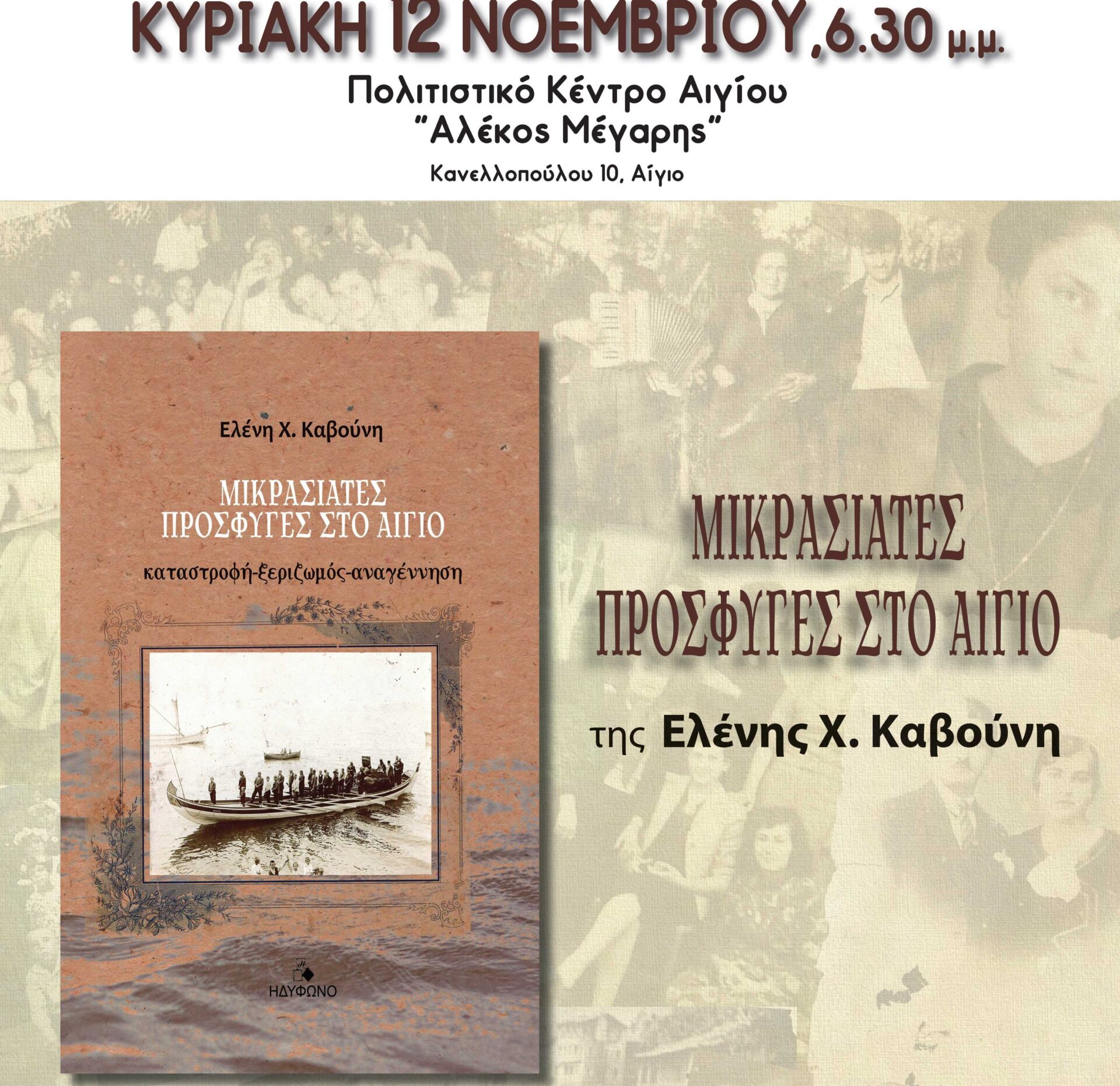 Παρουσιάζεται την Κυριακή 12 Νοεμβρίου, στις 6.30 το απόγευμα στο Πολιτιστικό Κέντρο Αιγίου «Αλέκος Μέγαρης», το βιβλίο-λεύκωμα της Ελένης Χρ.Καβούνη «Μικρασιάτες πρόσφυγες στο Αίγιο» που κυκλοφορεί από τις εκδόσεις ΗΔΥΦΩΝΟ. Πρόκειται για πολυτελές λεύκωμα, έργο ζωής της Ελένης Καβούνη, όπου μέσα από πλούσιο φωτογραφικό υλικό, μαρτυρίες και έγγραφα παρουσιάζεται και καταγράφεται η ζωή των προσφύγων του Αιγίου που έφτασαν κυνηγημένοι από τα Προκοννήσια ή Προικοννήσια κυρίως το Πασαλιμάνι, το Βόρι, την Αλώνη και τα Σκουπιά, αλλά και από άλλες περιφέρειες όπως Αρτάκη, Αλάτσατα, Βουρλά, Σμύρνη, Αϊβαλί, Προύσα, Νικομήδεια, Σαμψούντα, Τραπεζούντα κ.α.