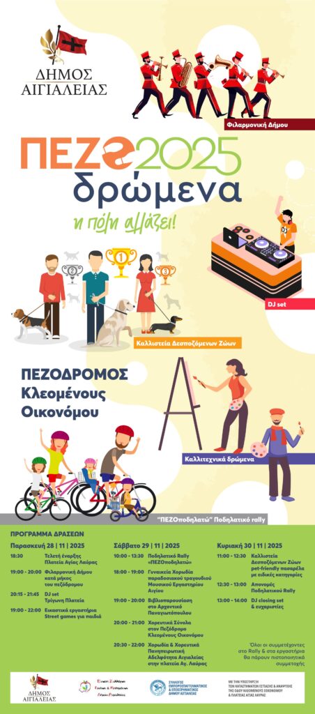 Ο Δήμος Αιγιαλείας διοργανώνει τα “ΠΕΖΟδρώμενα 2025”, μια τριήμερη γιορτή γεμάτη μουσική, τέχνες, ποδηλατικές δράσεις και εκδηλώσεις για όλη την οικογένεια. Από τις 28 έως τις 30 Νοεμβρίου, ο πεζόδρομος Κλεομένους Οικονόμου μετατρέπεται σε έναν ζωντανό χώρο πολιτισμού με συμμετοχή της Φιλαρμονικής του Δήμου, τοπικών καλλιτεχνών, χορωδιών, συνόλων και δεκάδων δράσεων για μικρούς και μεγάλους.