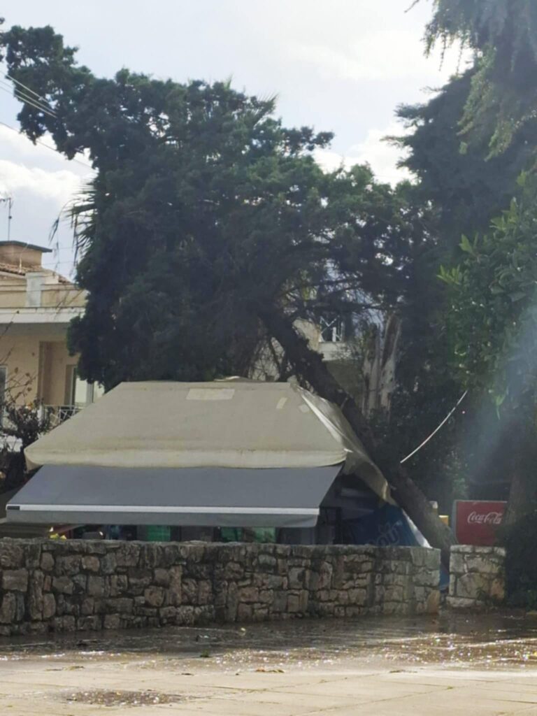 Σύμφωνα με τις πρώτες πληροφορίες, ένα από τα δέντρα έπεσε πάνω σε καλώδια της ΔΕΗ αλλά και σε περίπτερο, προκαλώντας υλικές ζημιές και αυξάνοντας τον κίνδυνο για τους διερχόμενους πολίτες.